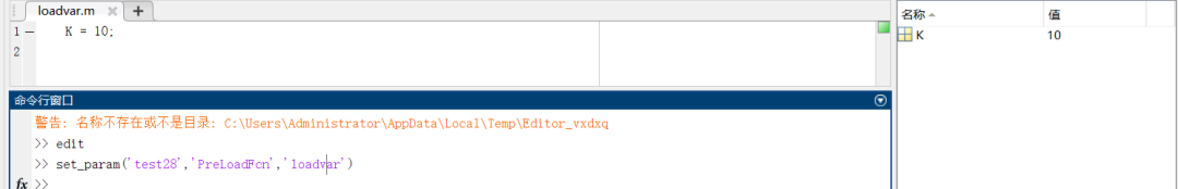 例如,假设模型名称为test28.slx,在 MATLAB定义变量的脚本名为loadvar,.m,其内容为K=10;在 Command Window中输人以下命令并按下回车: