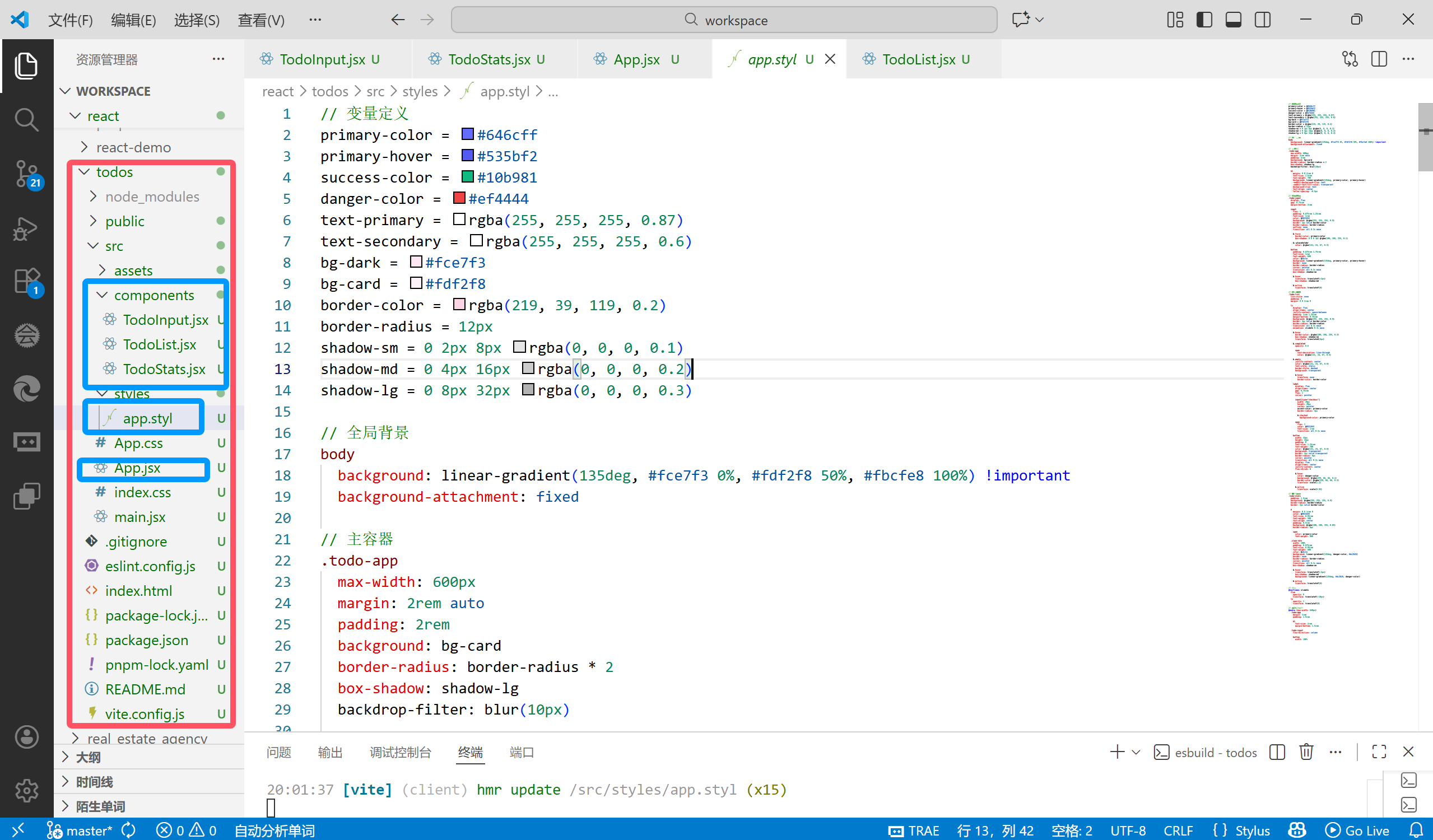App.jsx:核心组件,管着todos状态和所有修改方法(addTodo、deleteTodo等),负责给子组件传数据和方法;TodoInput.jsx:负责输入新待办,通过onAdd告诉爸爸;TodoList.jsx:负责展示待办列表,通过onDelete和onToggle告诉爸爸要删还是要改;TodoStats.jsx:负责展示统计信息,通过onClearCompleted告诉爸爸要清空已完成。