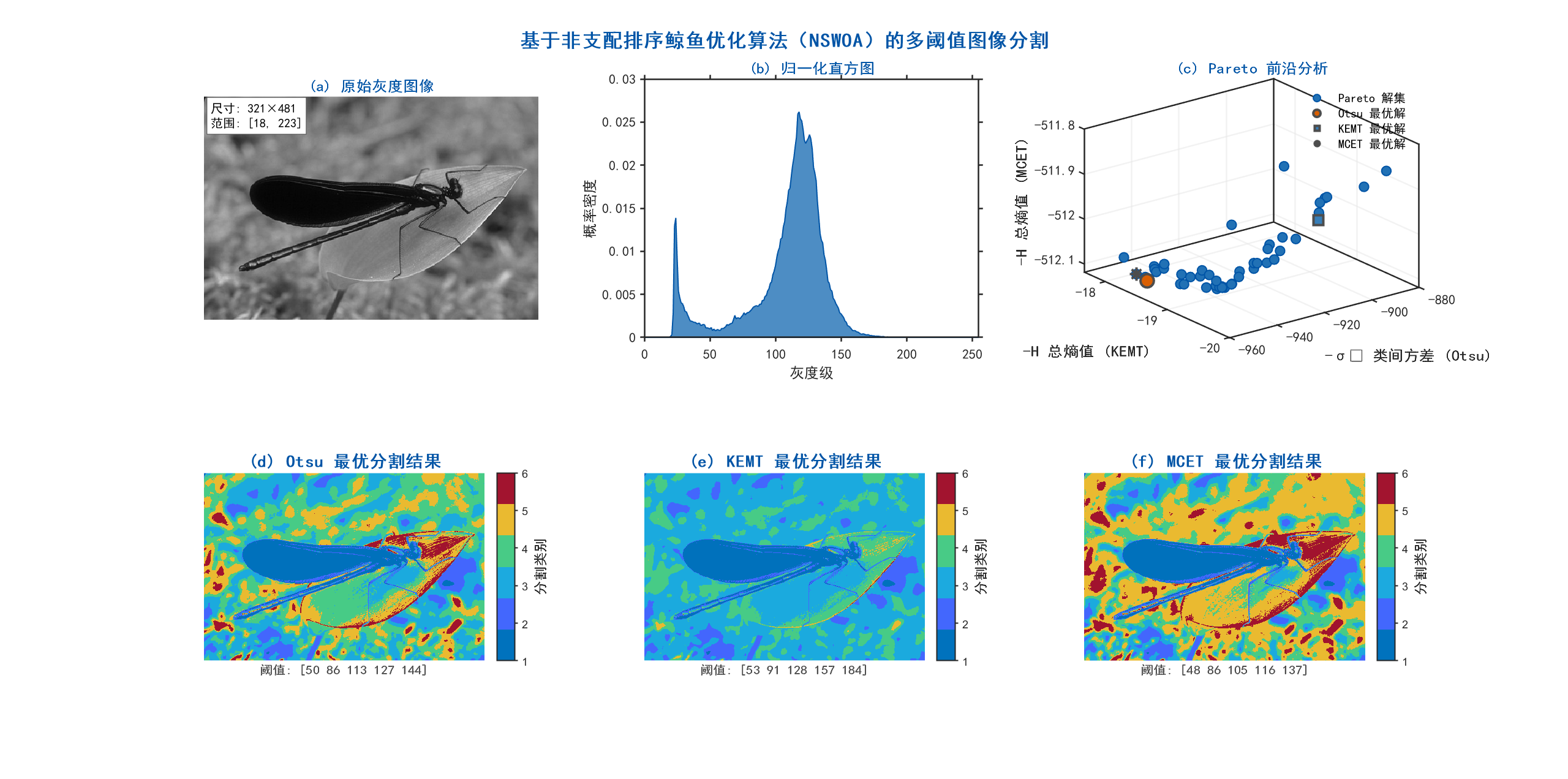1\] Jangir P, Jangir N. Non-dominated sorting whale optimization algorithm (NSWOA): a multi-objective optimization algorithm for solving engineering design problems\[J\]. Glob. J. Res. Eng, 2017, 17: 15-42. ## 5 改进方向 * 改进非支配排序鲸鱼优化算法,然后在阈值分割领域进行应用。 * 改进阈值分割函数获取图像不同维度的特征,然后应用非支配排序鲸鱼优化算法获取阈值。 * 不同领域图像数据集处理。面向不同领域图像的特征,设计不同的阈值分割函数,然后应用非支配排序鲸鱼优化算法获取阈值。 * 彩色图像处理。 * 将优化算法推广至多目标领域。 ## 6 MATLAB 代码 代码中包含详尽的注释!