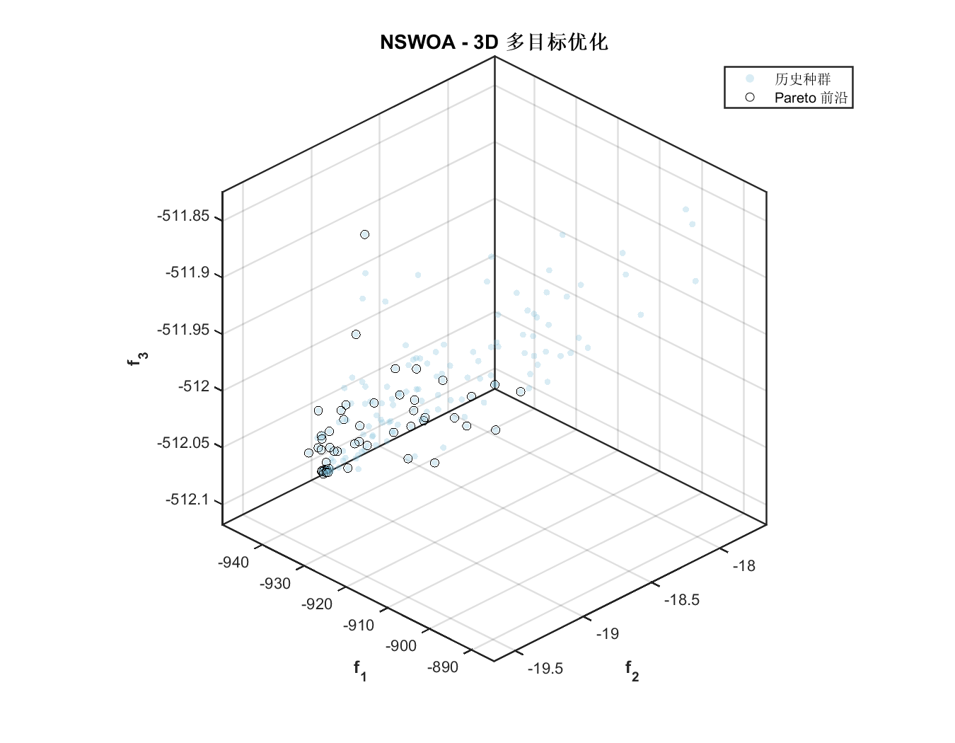 NSWOA 算法是鲸鱼优化算法(WOA)的多目标扩展版本,其核心在于引入非支配排序和拥挤距离机制来引导种群朝真实的帕累托前沿进化,并利用外部档案集保存历史最优非支配解。