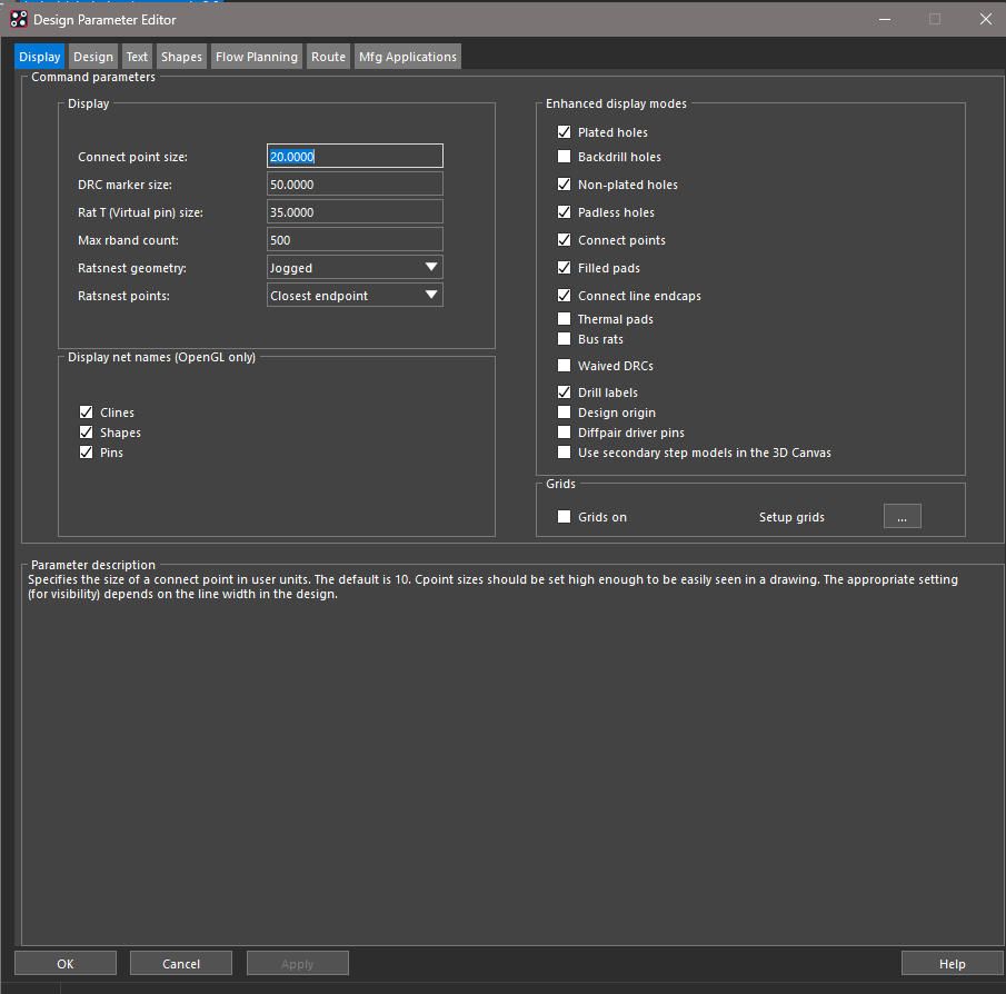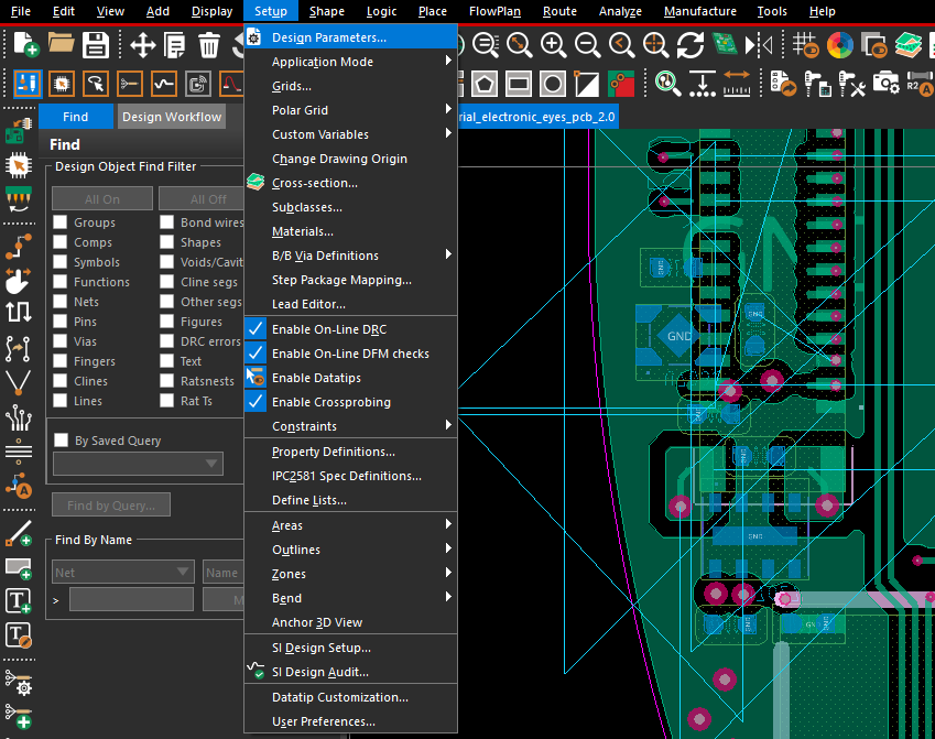 cadence画板中未连接的线路会以飞线的形式显示,飞线在焊盘上显示会三角形折线,有时三角形太大会超过器件,看起来就不直观。这个显示的三角形大小也是可以调整的。