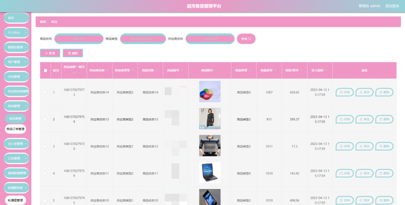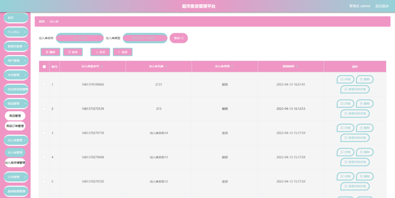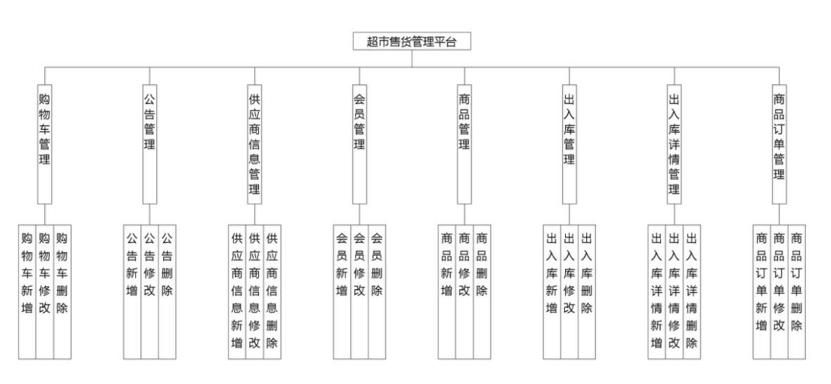 超市售货管理平台管理系统按照操作主体分为管理员和用户。管理员的功能包括购物车管理、字典管理、公告管理、供应商信息管理、会员管理、商品管理、出入库管理、出入库详情管理、商品订单管理、用户管理、管理员管理。用户的功能等。