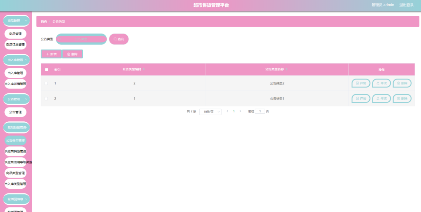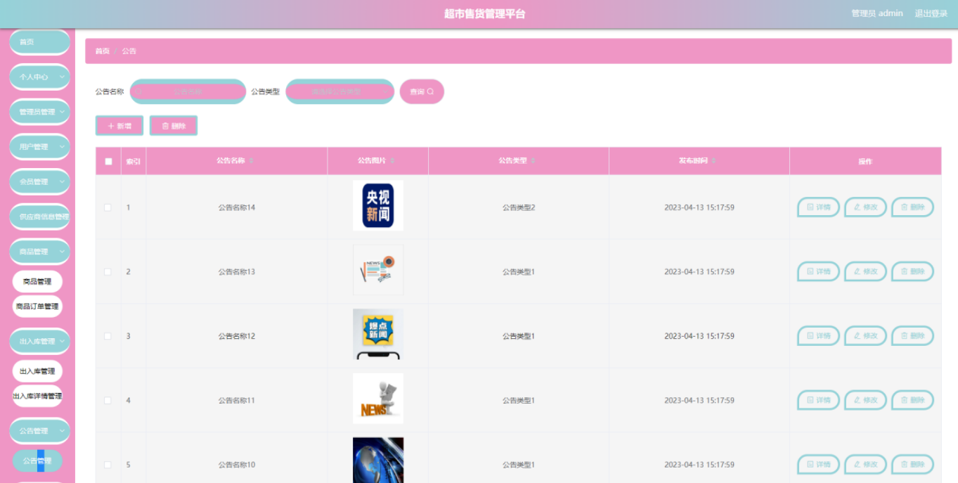 公告管理界面,管理员在公告管理界面中新增公告,可以删除公告。
