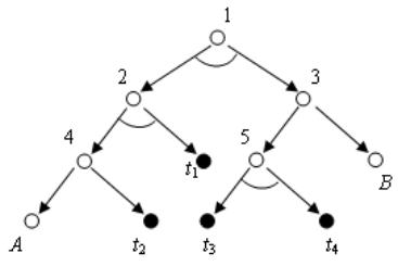 3. 示例执行(与或树含终叶节点t1-t4,不可解节点A、B)