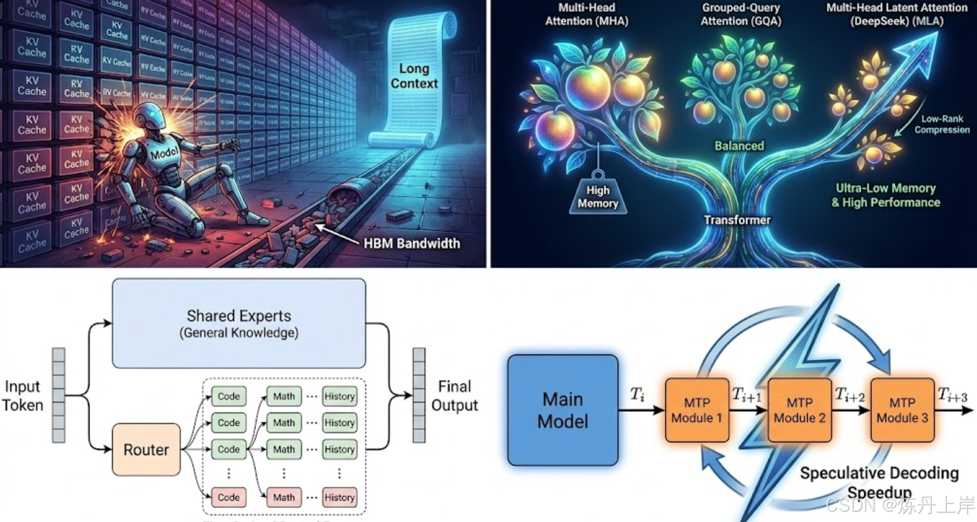 - 多头潜在注意力机制 (MLA): 极致优化显存效率。