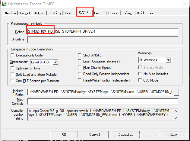 2)C/C++ 选项:根据目标芯片的 Flash 容量(大/中/小),在宏定义列表中对应修改为: