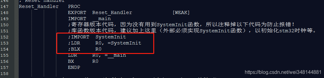 .s汇编文件中,分号;为注释符)。若未取消该段代码的注释,将导致系统时钟无法完成初始化操作。因此,使用库函数版本工程时,必须删除该段代码的注释符号。