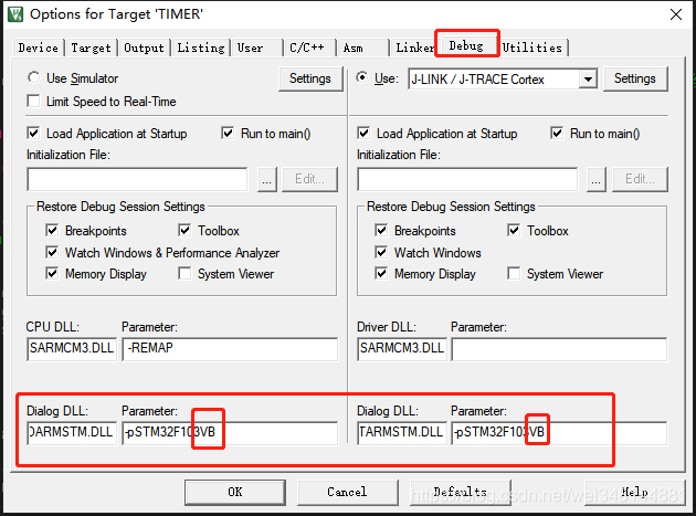STM32F10X_HD、STM32F10X_MD、STM32F10X_LD。3)Debug 选项:根据目标芯片型号修改对应参数,例如目标芯片为 STM32F103VBT6 时,需将参数修改为