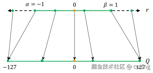 以 int8 为例,范围是 ([-128, 127]),我们通过一个缩放因子(scale)实现近似: