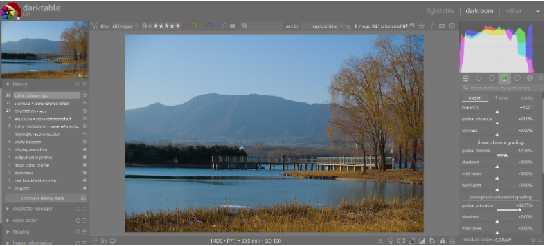 颜色明显变的明快了起来,虽然调整的不是那么细节,更细节的话darktable每个功能模块都可以使用蒙版,先扣出蒙版再调颜色,避免对其它区域干扰,效果肯定更好。可能有人会问,你这一顿操作,又是光色互补原理,又是darktable调色模块,效果不就是加了点饱和度吗?好像也没什么毛病,我试试在原片上只加饱和度,效果如下: