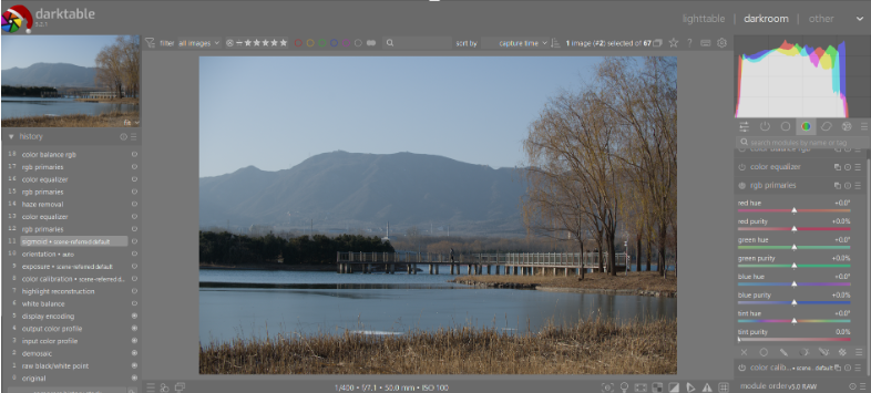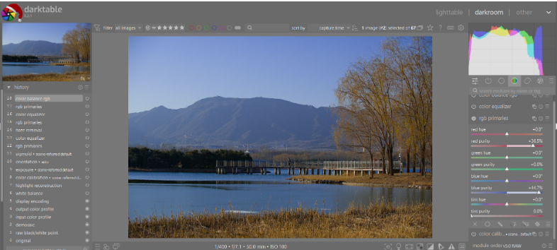 书中用的是camera raw软件,在开源领域其实也有同样功能强大的软件darktable,darktable在颜色调整方面也有强大且灵活的工具,简单的rgb primaries调整和color equalizer分区颜色调整器,还有更高级的color balance rgb,这些工具需要在理解光色互补原理上进行使用,以color equalizer为例: