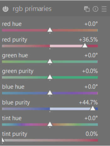 它的三个tab分别是色调、饱和度和明度调整,可以用拾色器选取对应颜色然后拖动曲线上的点进行调整。还有rgb primaries: