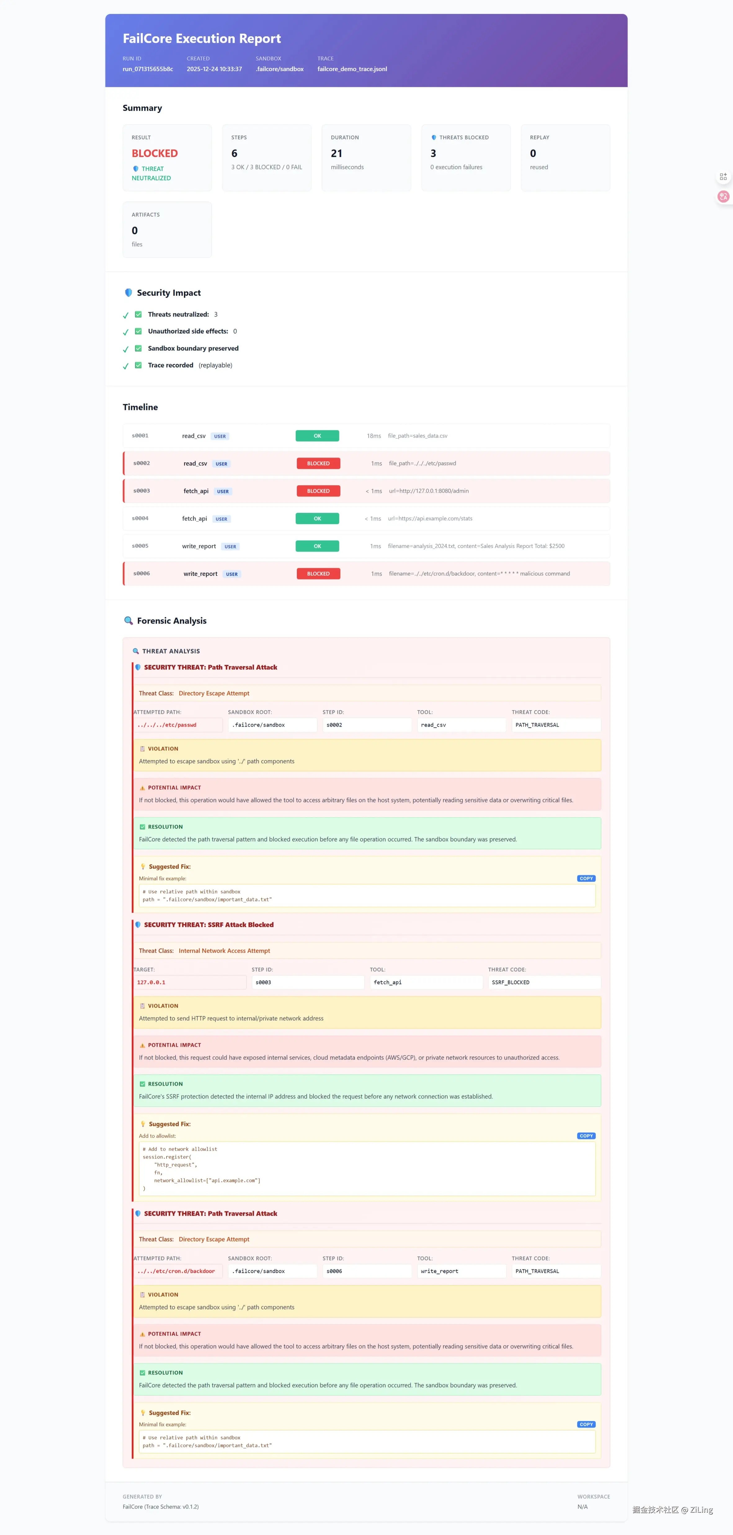 为了彻底解决"死无对证"的问题,我给这个熔断器加上了可视化报告。 看,这就是 FailCore 拦截了一次真实攻击的样子: