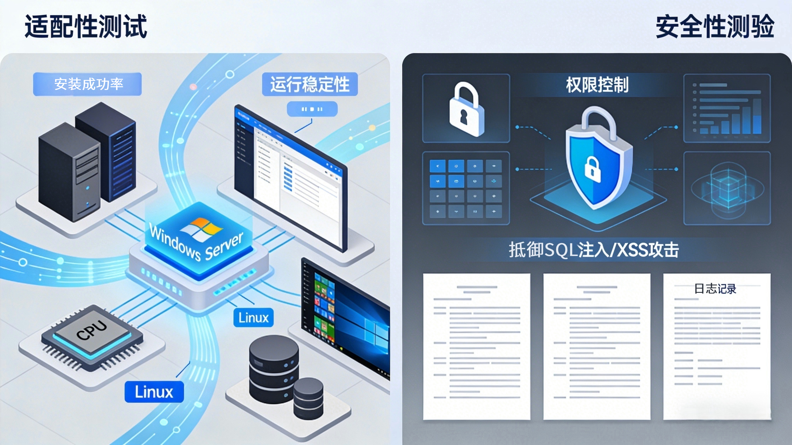 安全性测试方面,需验证部署过程中的数据加密效果、权限控制机制,以及平台对外部攻击的防护能力。比如,测试平台部署后,数据库密码是否采用加密存储;是否能有效抵御SQL注入、XSS攻击等常见安全风险;平台的日志系统是否能完整记录部署过程和运行过程中的操作日志,便于安全审计。