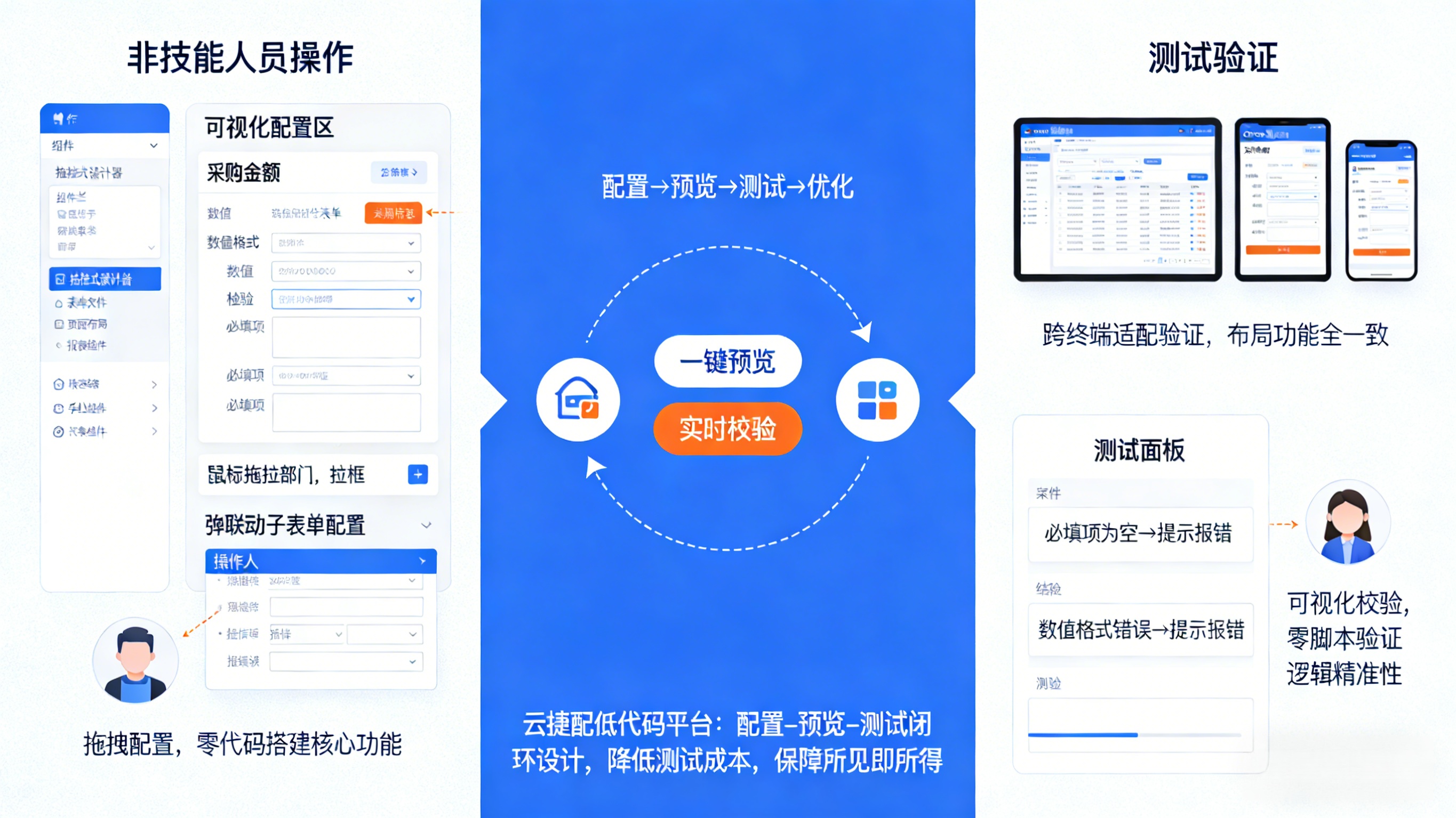 以云捷配低代码平台为例,其表单设计器、页面设计器等工具内置了可视化的校验规则配置功能,测试过程中可直接通过设计器预览校验效果,无需手动编写测试脚本。同时,测试人员可快速模拟不同用户角色的操作场景,验证配置逻辑的准确性。这种"配置-预览-测试"的闭环设计,大幅降低了可视化配置环节的测试成本,提升了测试效率。