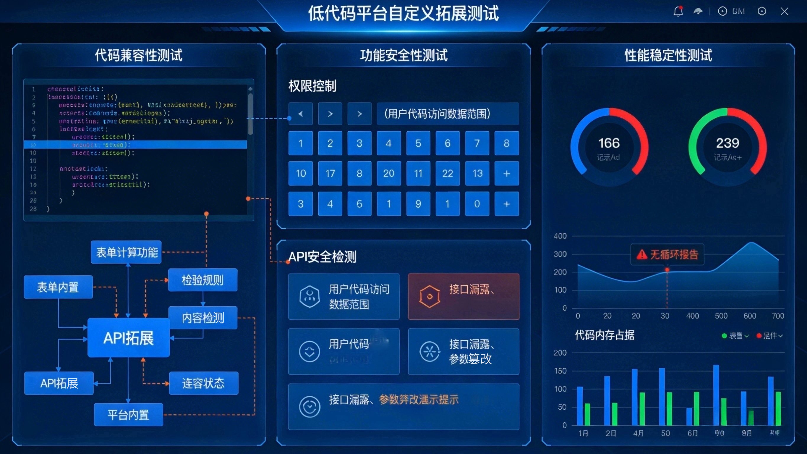低代码平台不仅要满足不懂技术用户的"零代码"搭建需求,还要支持懂技术用户的"代码拓展"需求,实现个性化定制开发。这种"配置+代码"的混合开发模式,容易出现代码与配置不兼容、拓展功能影响平台稳定性等问题。因此,自定义拓展环节的测试需重点关注"代码兼容性""功能安全性""性能稳定性"三大核心。
