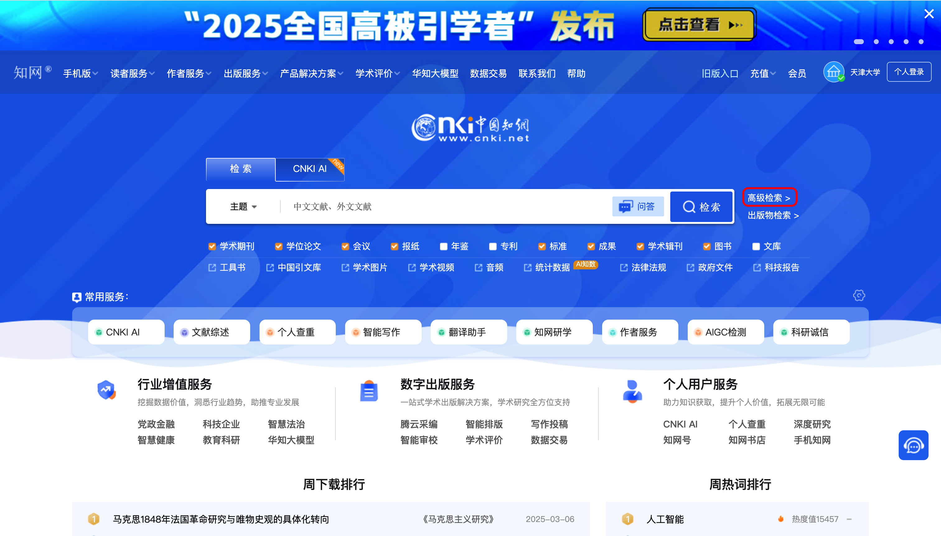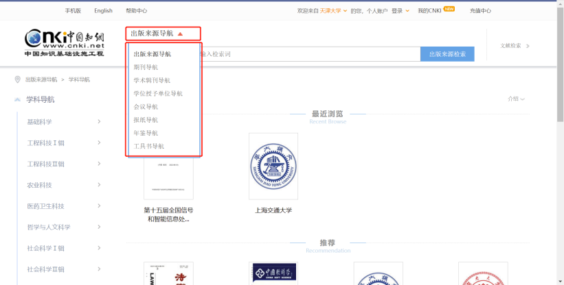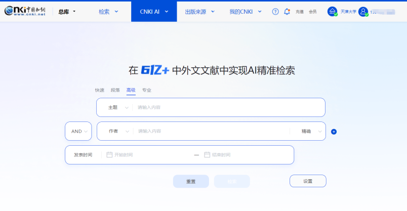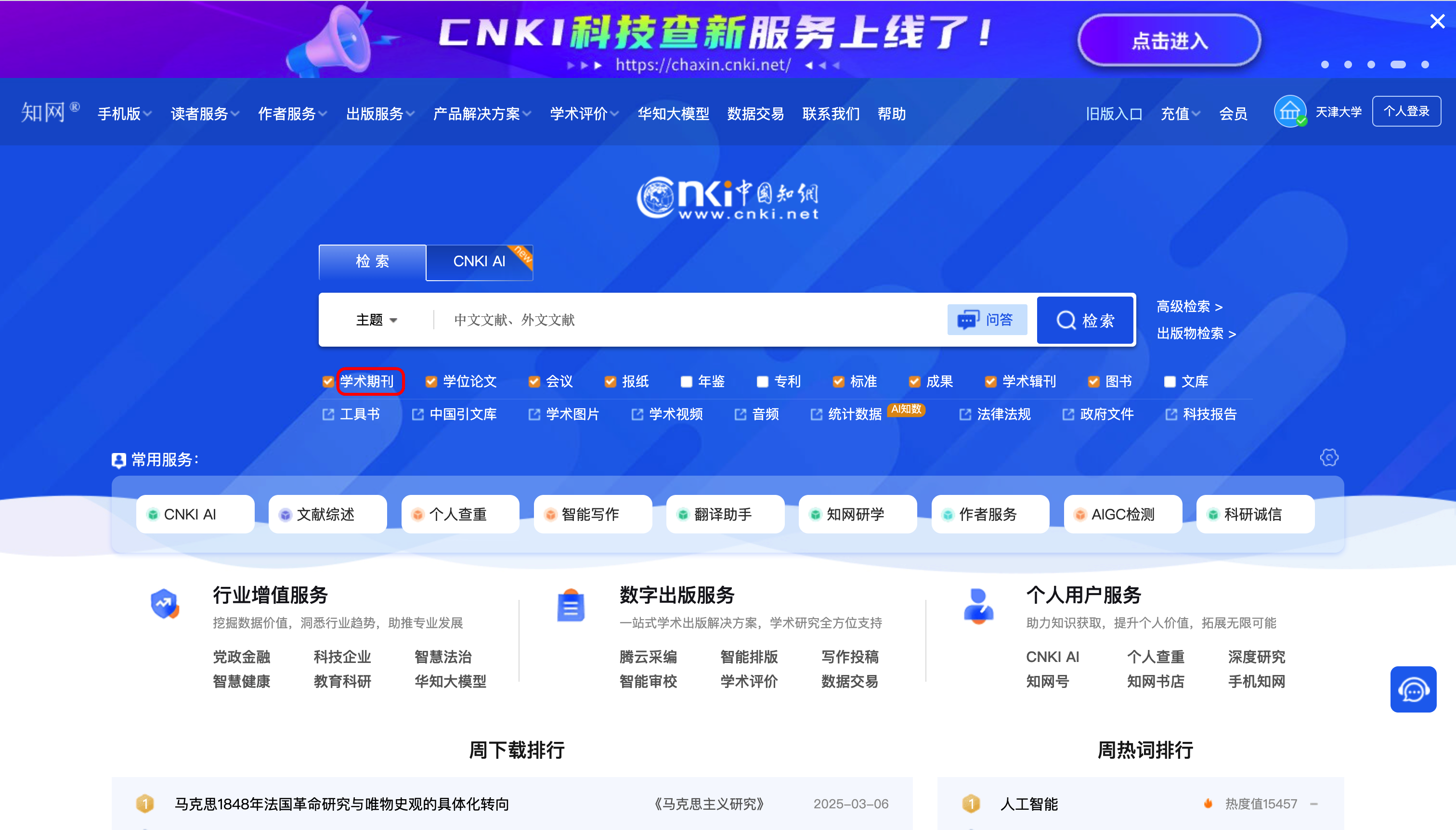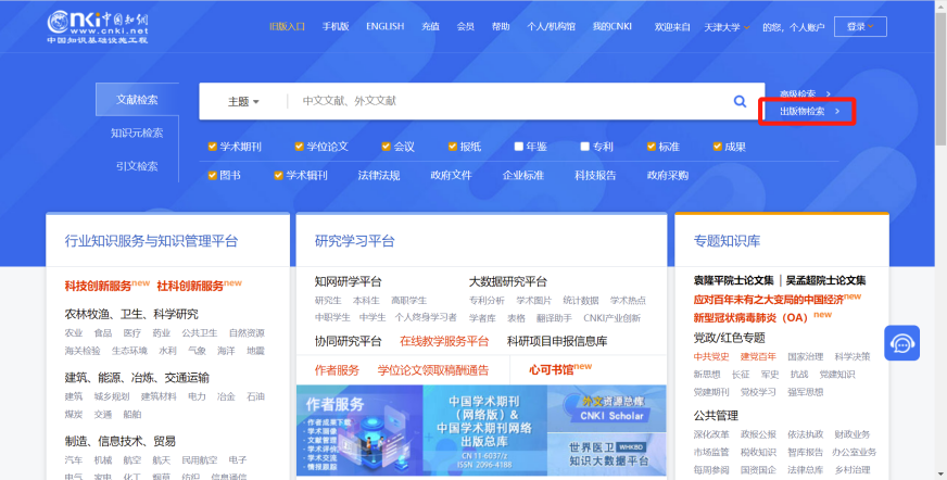 同样通过天津大学图书馆电子资源平台,登录后搜索CNKI并跳转到CNKI检索网站。