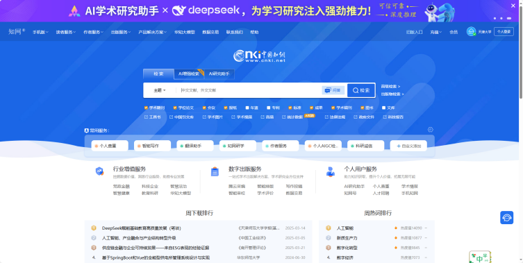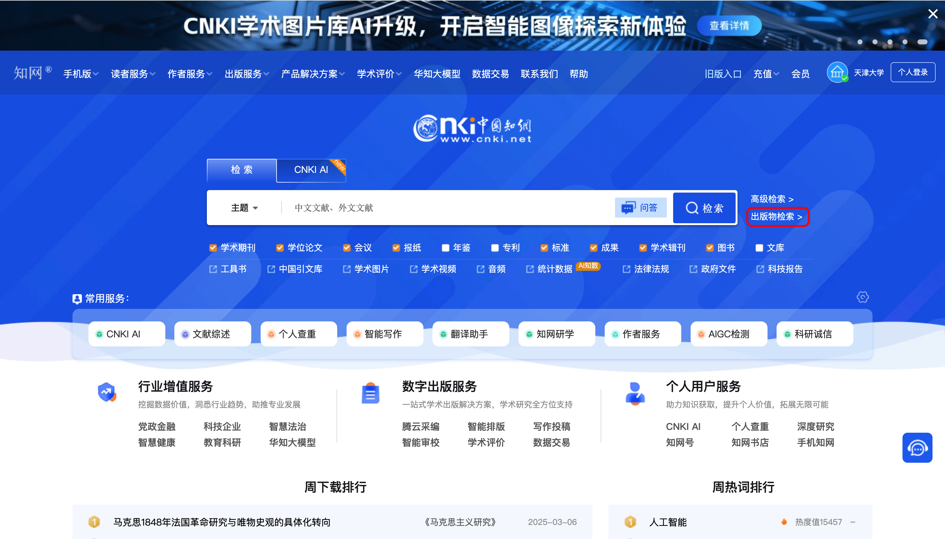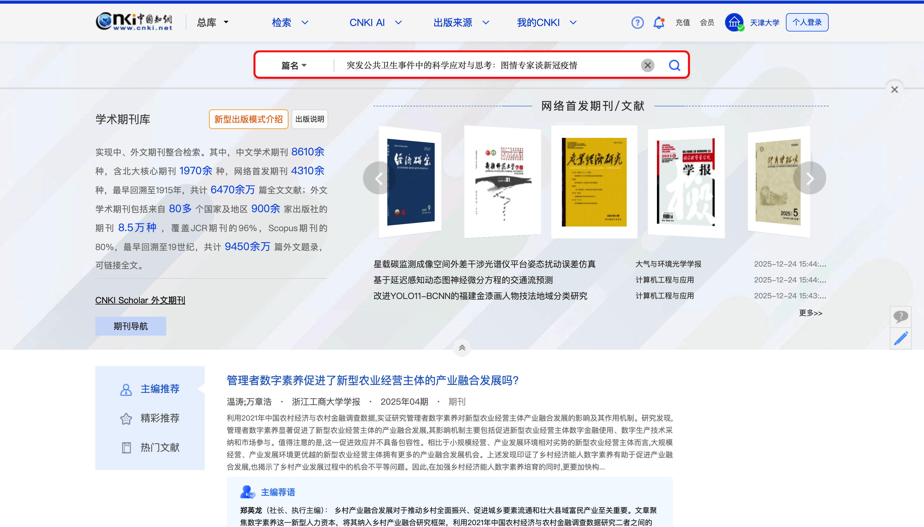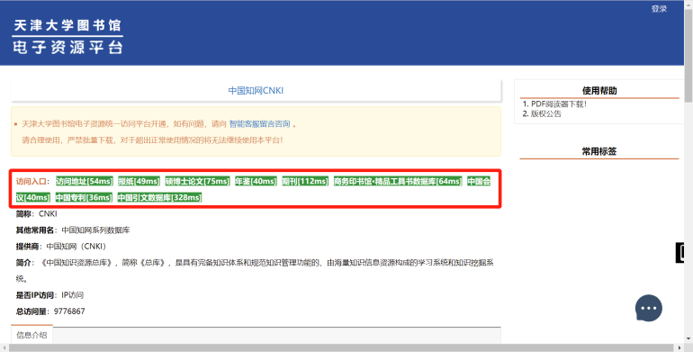 同样通过天津大学图书馆电子资源平台,登录后搜索CNKI并跳转到CNKI检索网站。