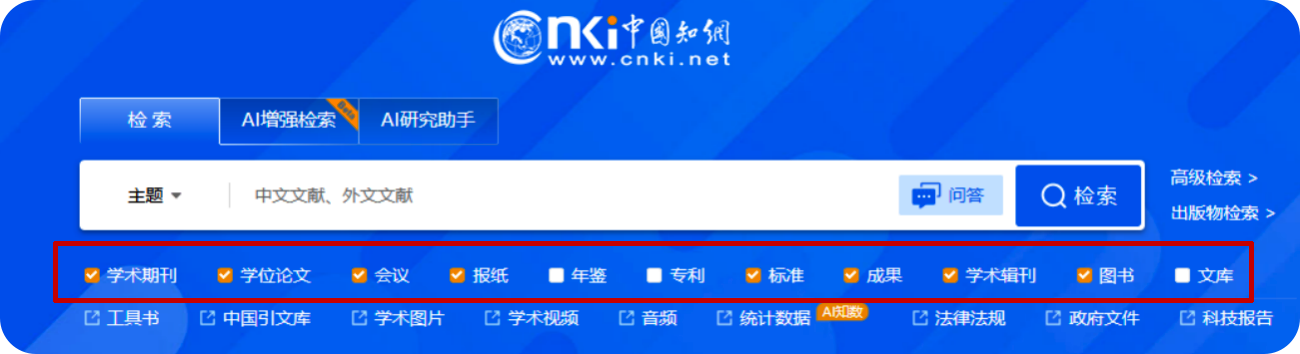 CNKI检索包括: 简单检索、跨库检索、出版物检索、高级检索、专业检索、作者发文检索、句子检索以及CNKI AI。
