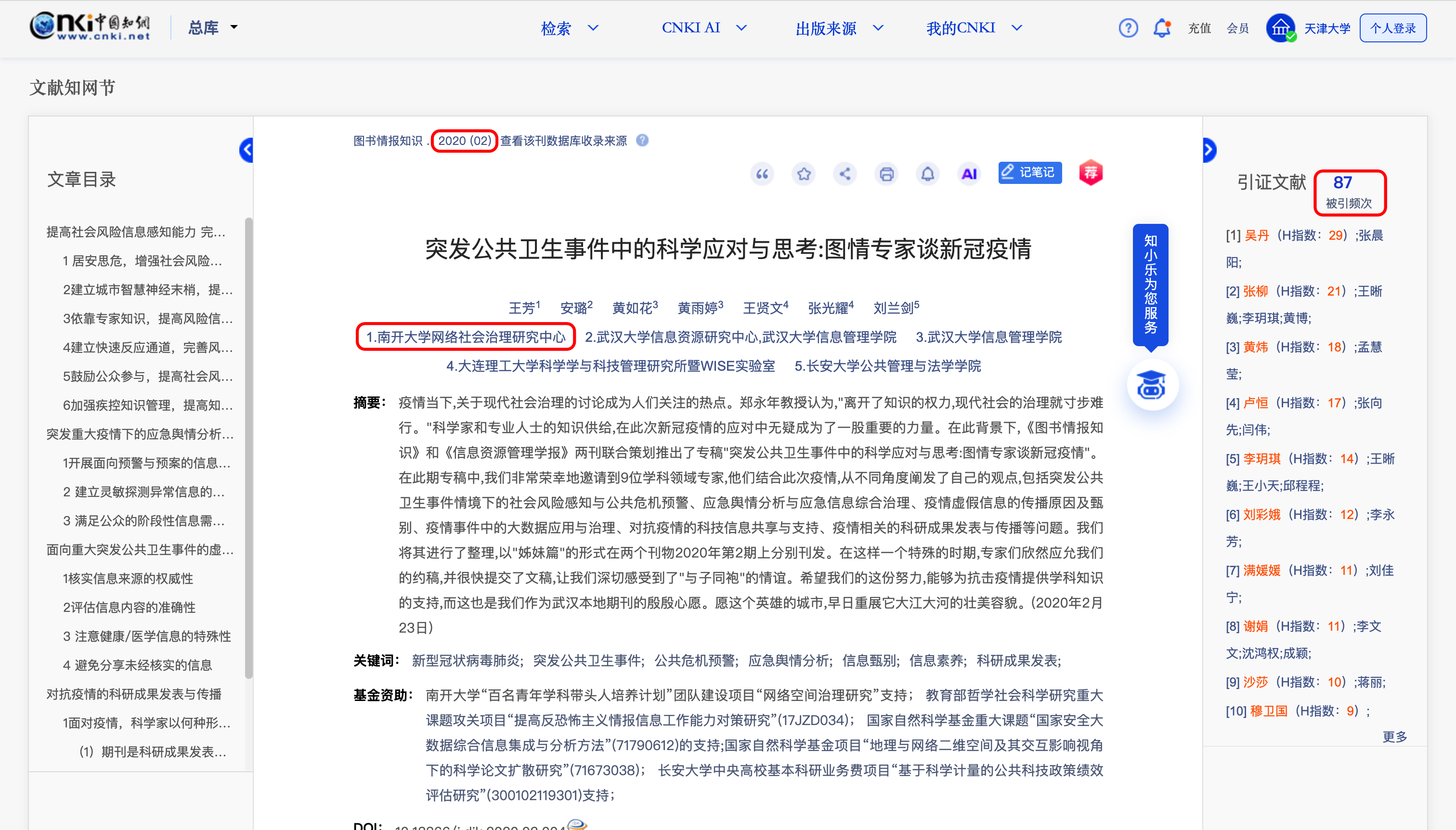 可以看到,第二篇发表在《图书情报知识》的文章第一作者单位是南开大学网络社会治理研究中心,出版年是2020年,被引频次是87。