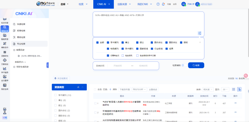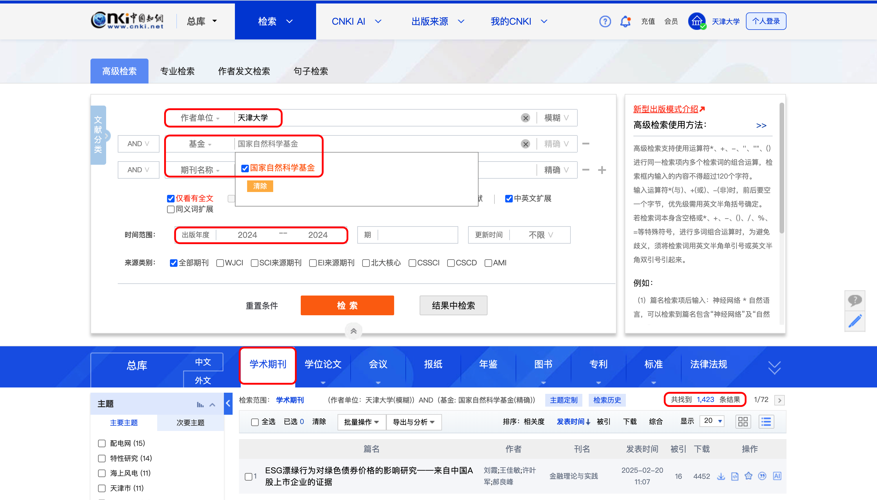 在高级检索界面,选择学术期刊类型,作者单位为天津大学,基金为国家自然科学基金,时间范围为2024------2024。可以看到最终检索到1423条结果。