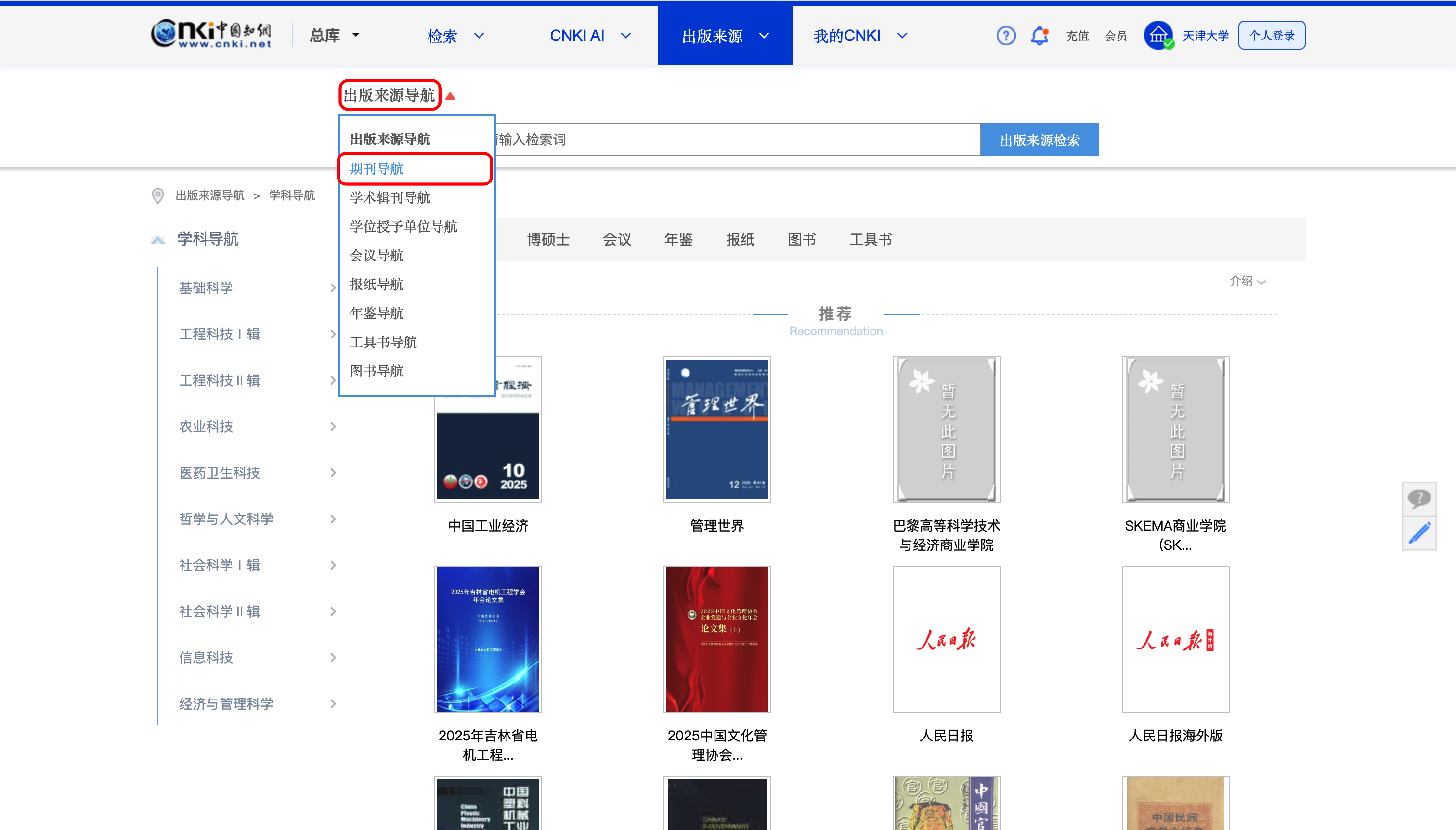 进入天津大学图书馆电子资源平台,登录后搜索CNKI。网站地址:https://eds.tju.edu.cn/ermsClient/browse.do。