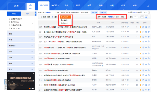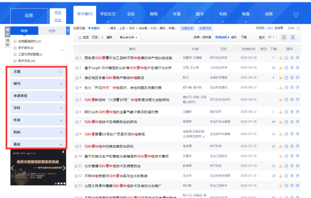 通过主题、期刊、来源类别、学科、作者等维度对当前检索结果进行聚类统计。