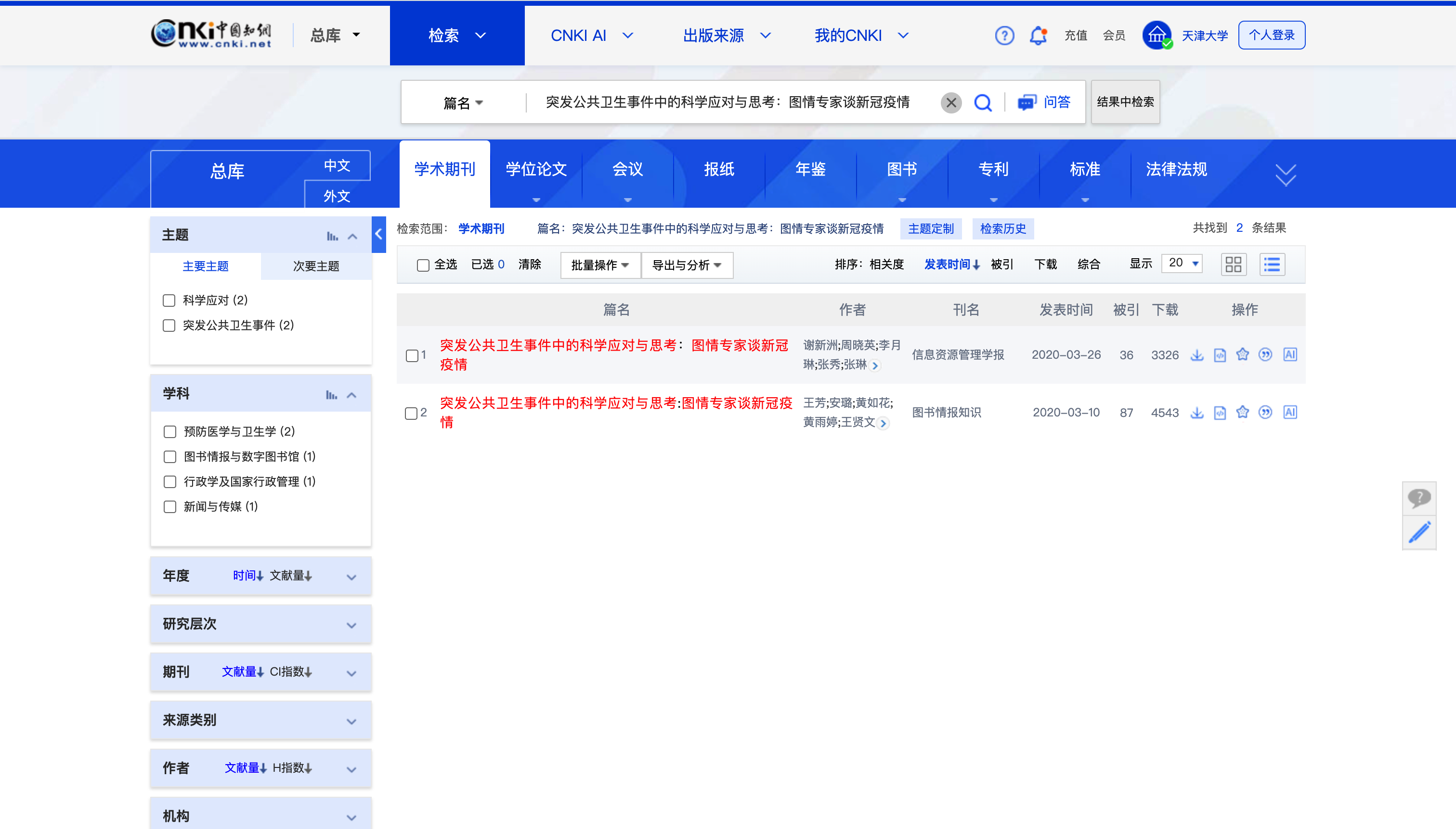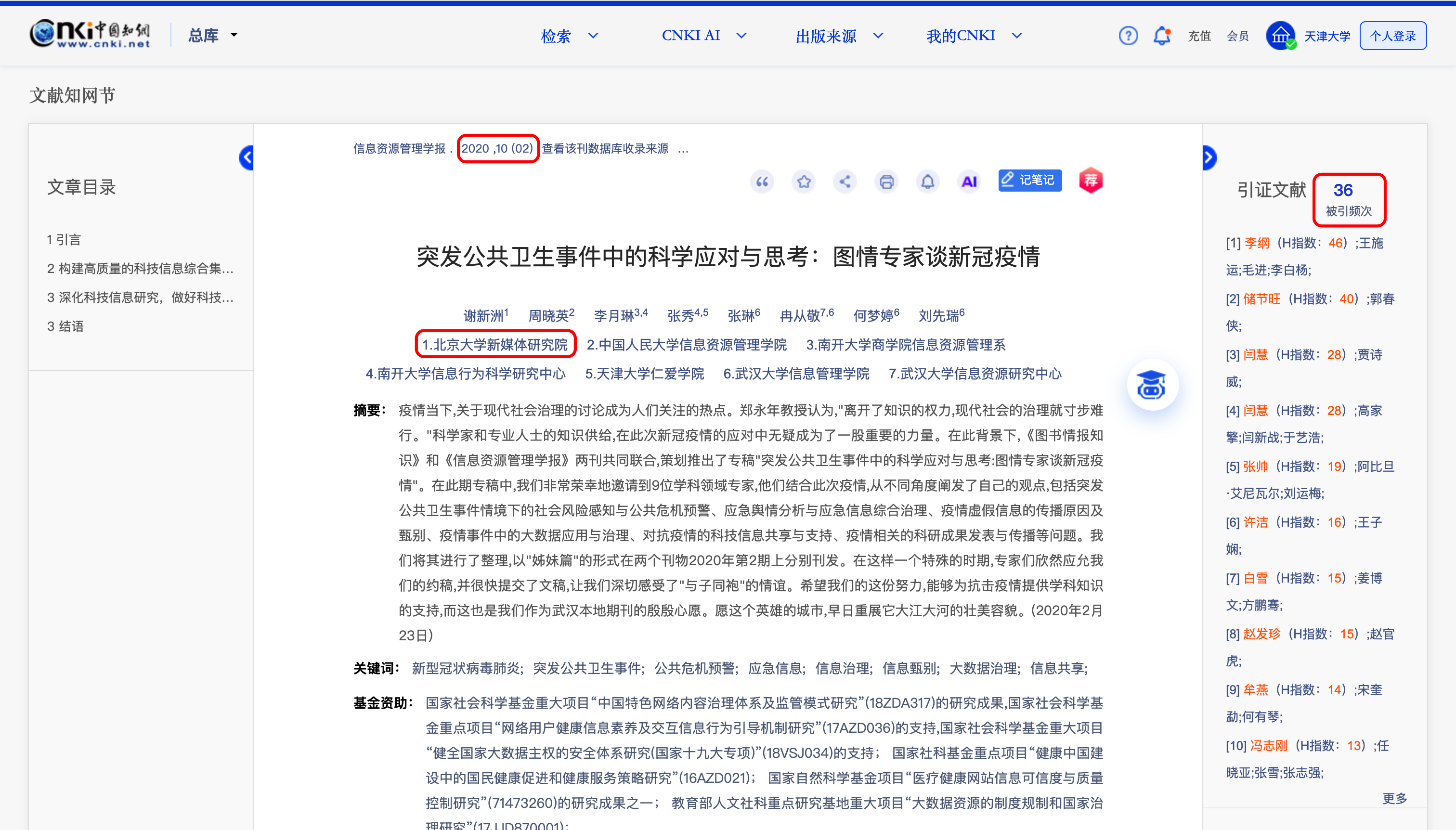 3、利用CNKI学术期刊数据库检索文献:"突发公共卫生事件中的科学应对与思考:图情专家谈新冠疫情",给出这篇论文第一作者单位、出版年和被引频次。