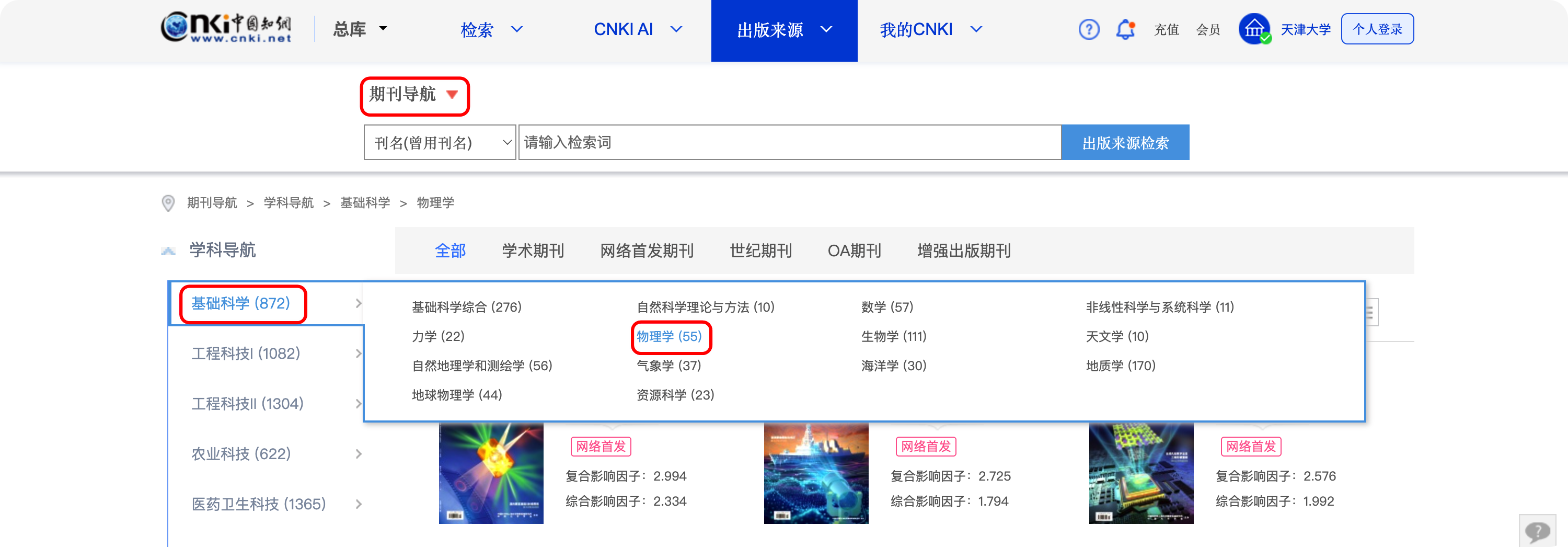 在学科导航中,选择"基础科学"中的"物理学",可以看到CNKI收录的"物理学"期刊有55种。