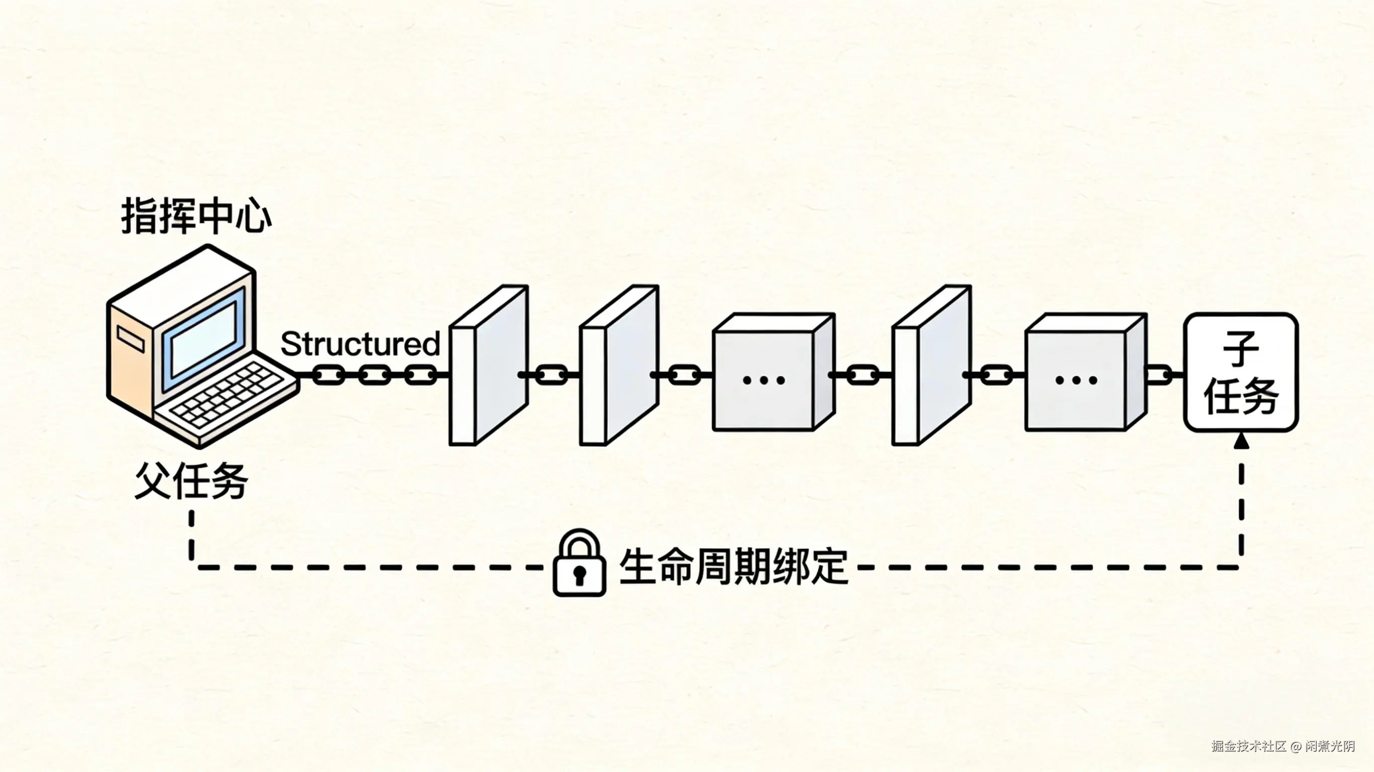 结构化并发就像"组织团队出差",父任务是"出差负责人",子任务是"团队成员"。负责人出发(父任务启动)时,成员一起出发(子任务启动);负责人返程(父任务结束)时,无论成员是否完成工作,都必须一起返程(子任务终止);若负责人遇意外(父任务异常),会立即通知成员集合(子任务中断),避免成员失联(孤儿线程)。