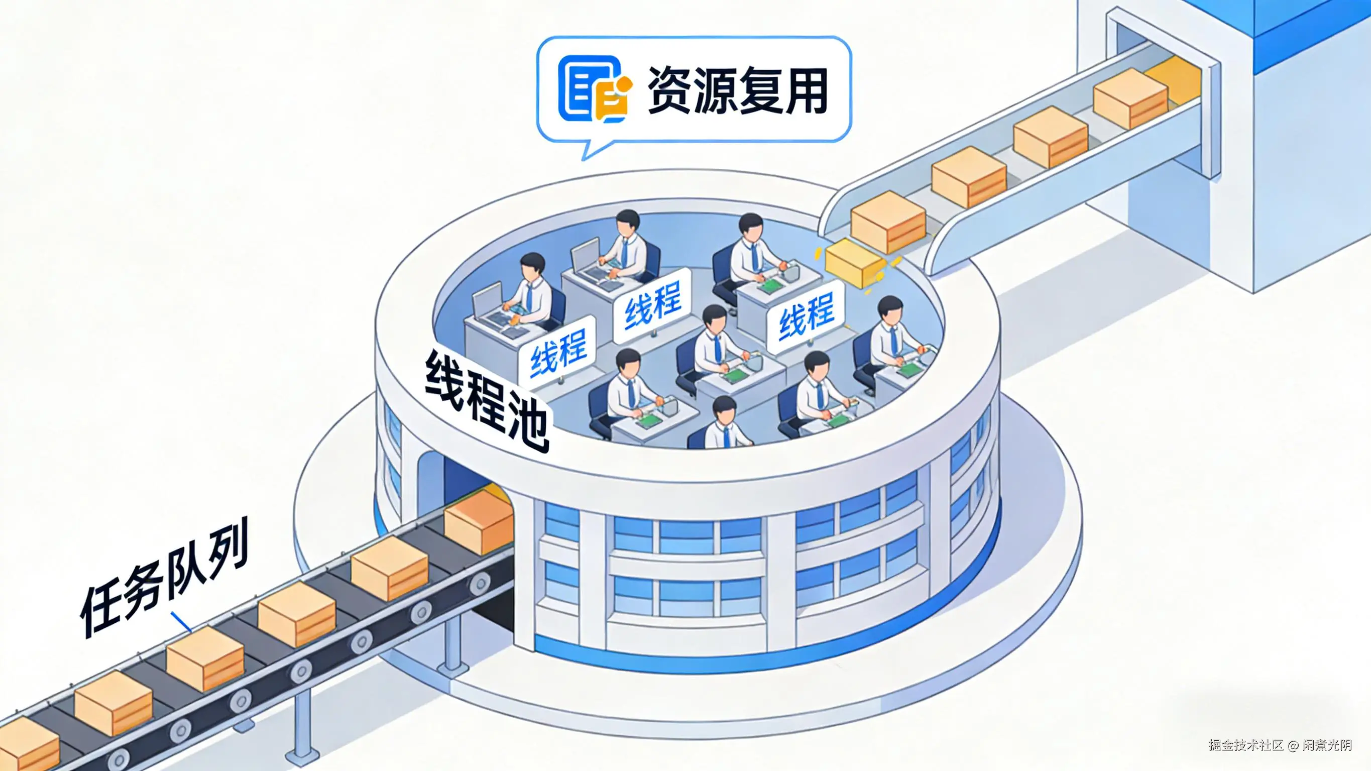1. 线程池:相当于"施工队管理处",复用线程不浪费