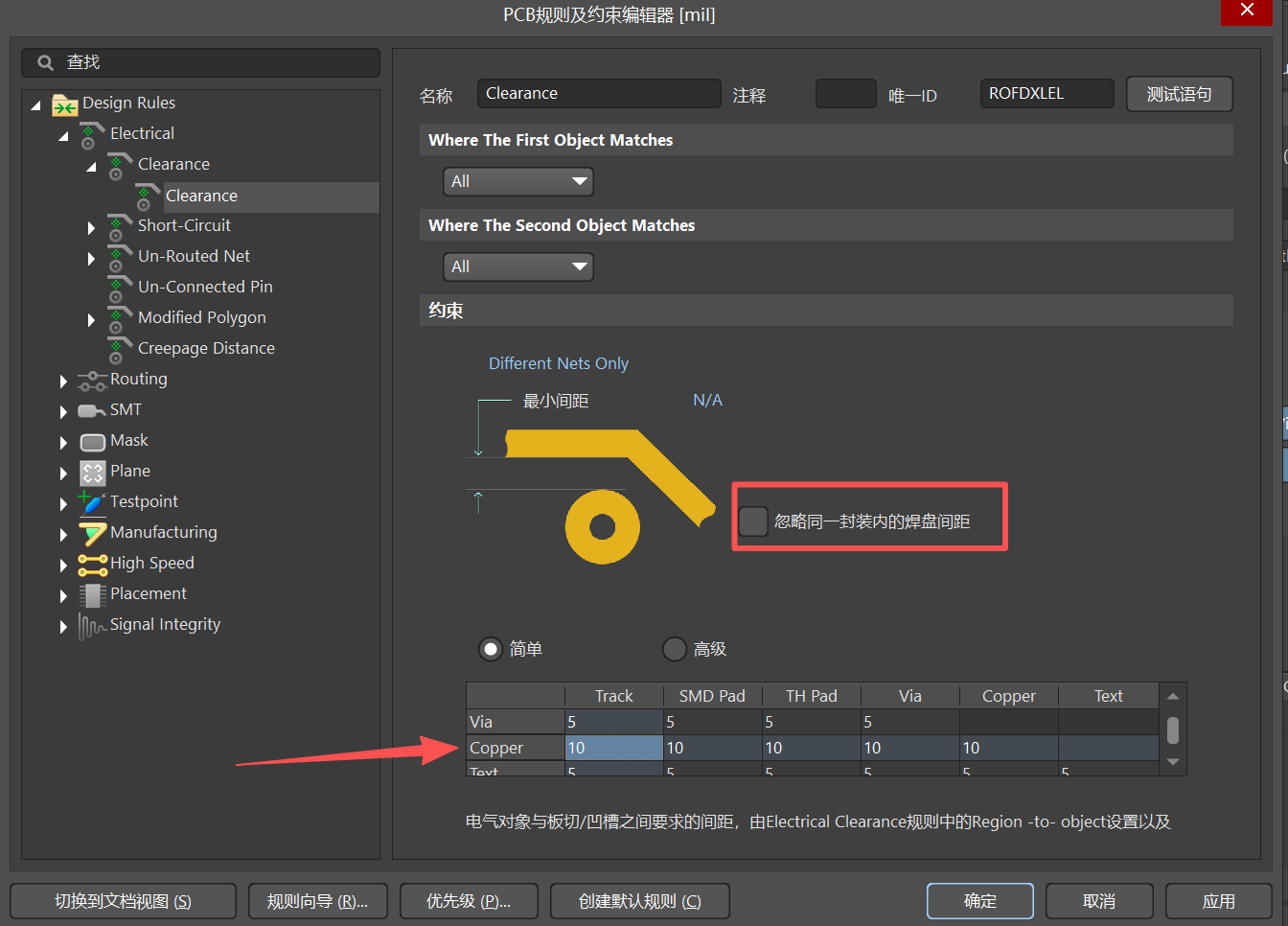 Clearance 规则常用的设置中,还可以将铜箔和走线之间的间距设置为10mil,可以让铜箔和走线距离拉开一些;将忽略同一封装内焊盘间距的勾选上,可以忽略因间距问题,造成的封装错误报错。