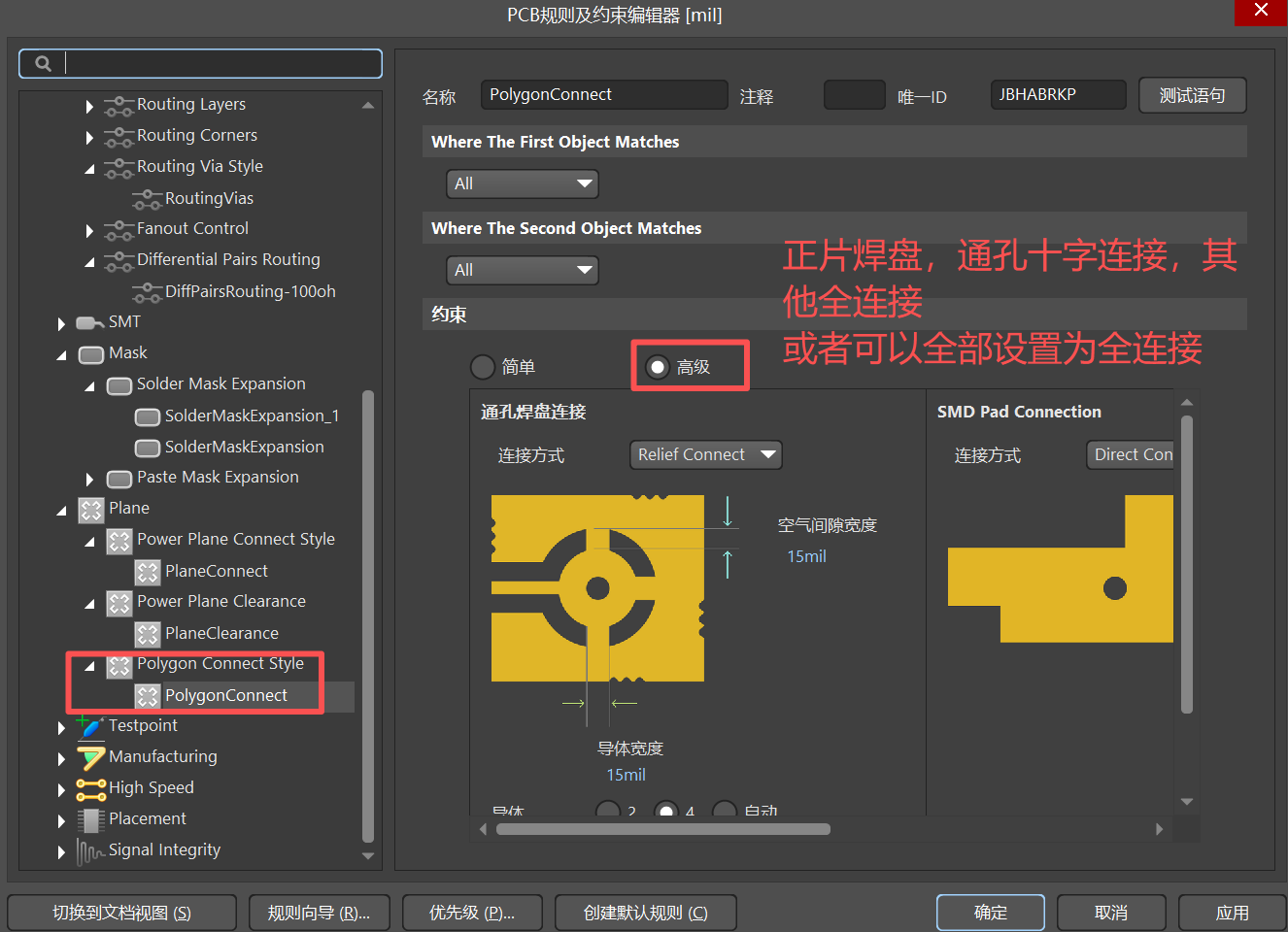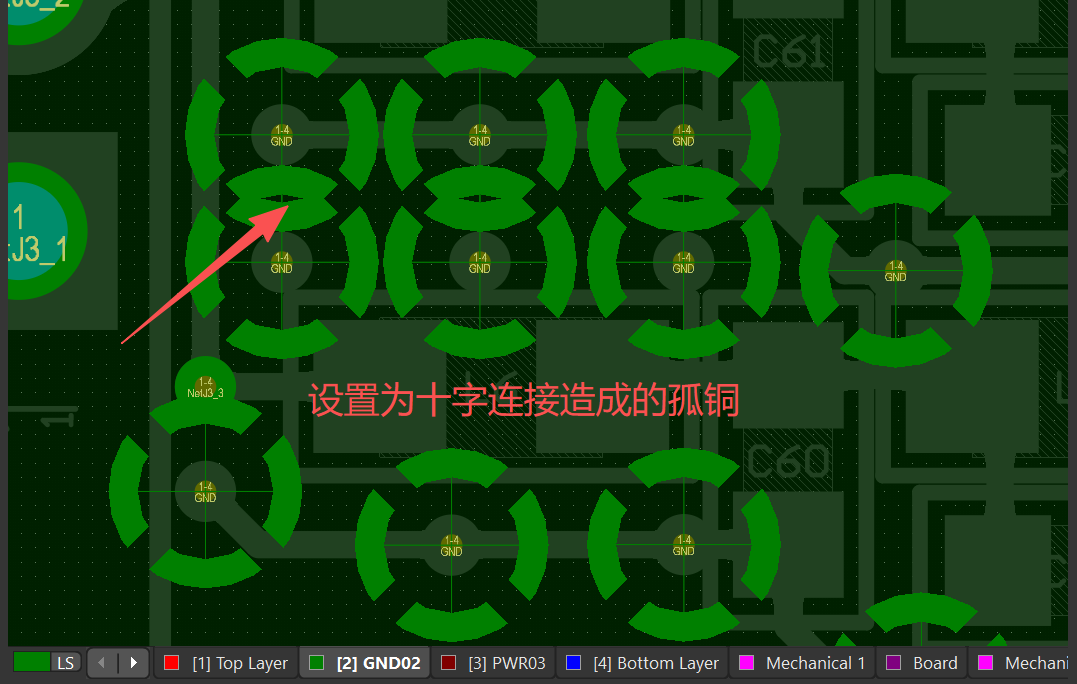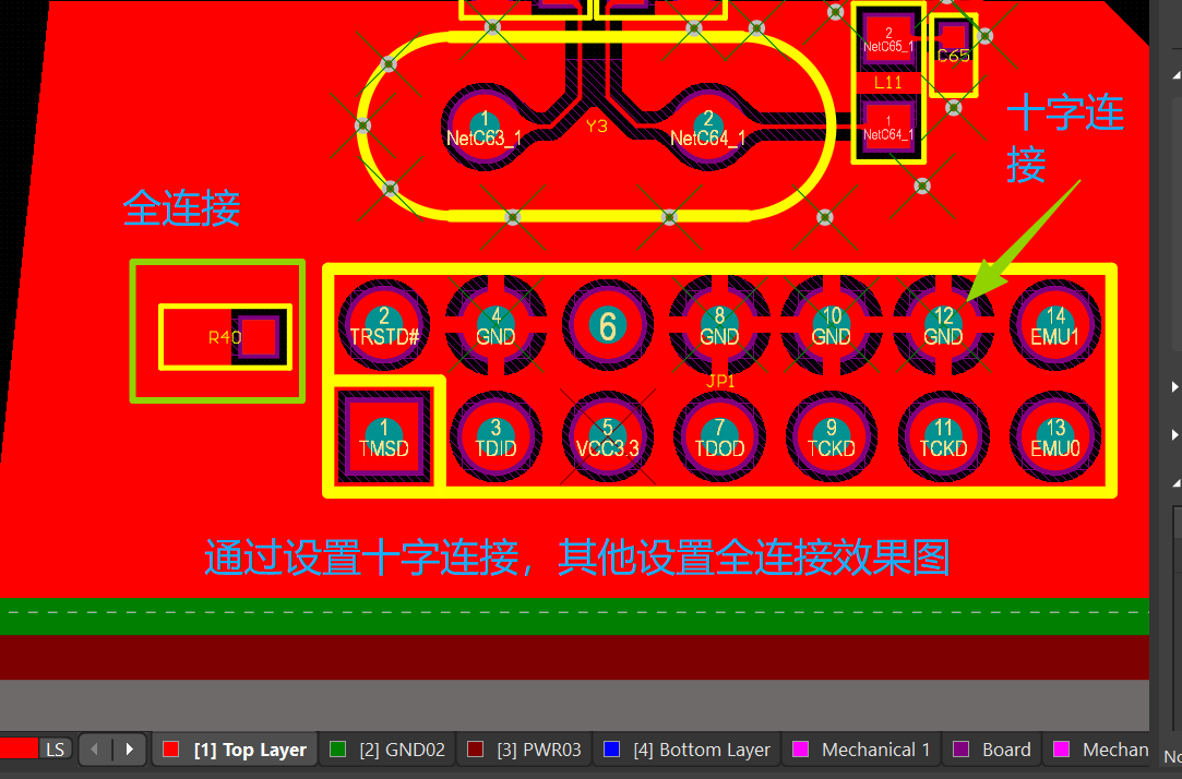 十字连接呢,它焊接好焊,一般我们板子的生产流程里,贴片元件是使用SMT完成,而直插的元件是生产部工人手工插件焊接,所有一般情况下把通过设置为十字连接,其他设置为全连接。