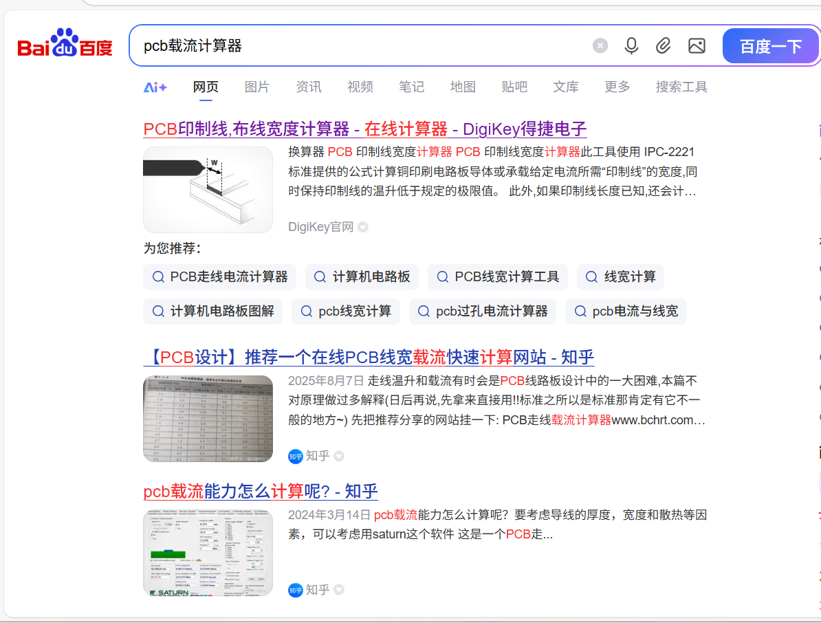 关于PCB载流的计算,某度可以直接搜索出来,在线计算即可,也根据经验值来设置,跳过计算的步骤。
