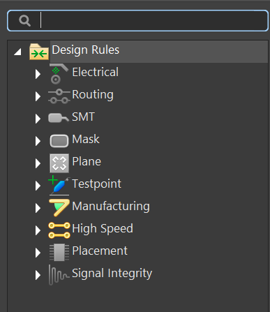 我们调出AD 设计规则,可以看到,规则一共有10个大类,这10个大类的规则分别是: