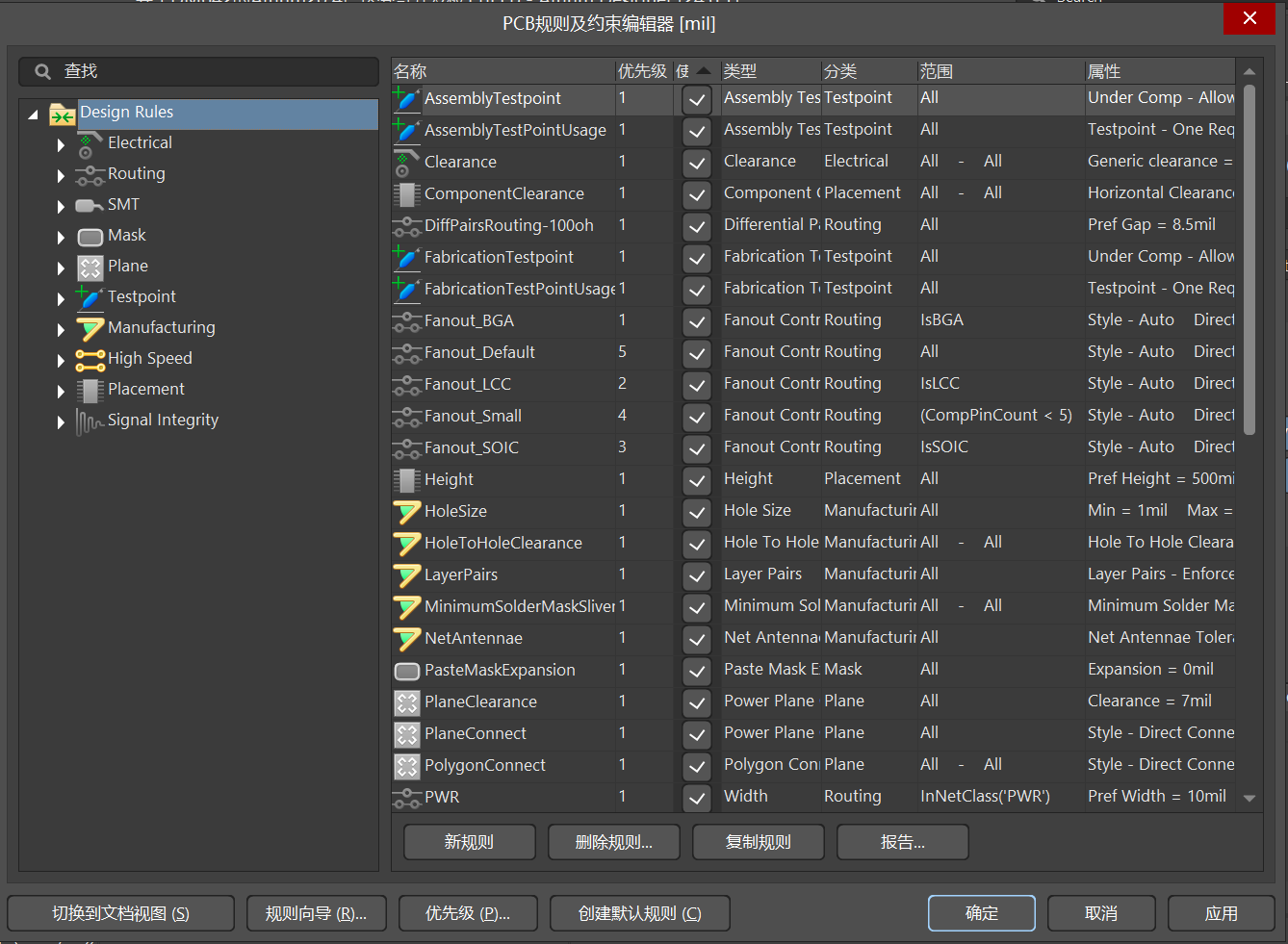 以上就是Altium Designer PCB 的一些常用的规则设置,设置好这些规则可以应付 80% 左右的PCB绘制,其他设置默认即可,或者有一些根据绘制时,根据需要进行设置(如高速PCB等长规则、3W间距规则、散孔规则等)