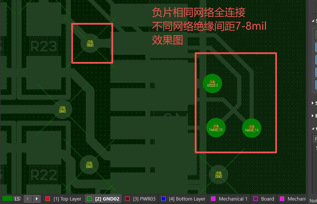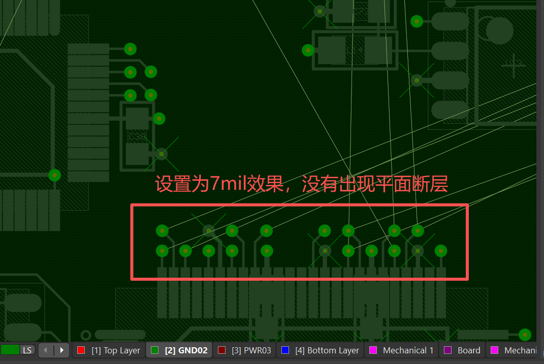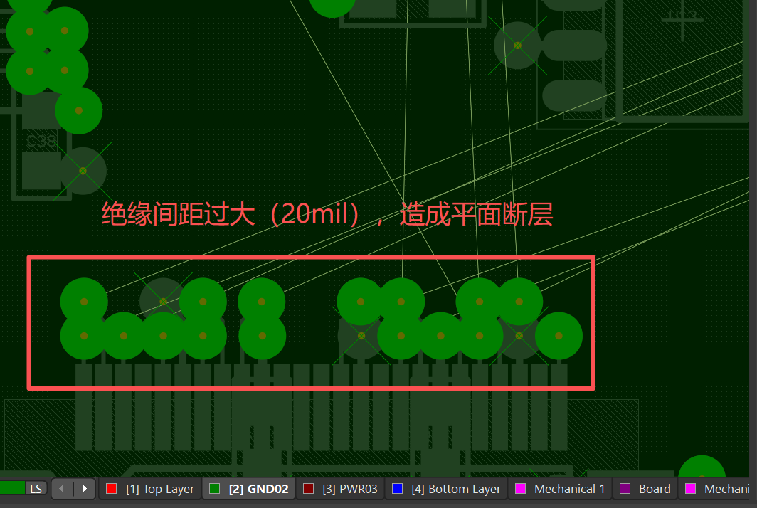 设置为反焊盘绝缘间距 7-8mil 防止反焊盘间距过大,造成的一个平面断层问题。