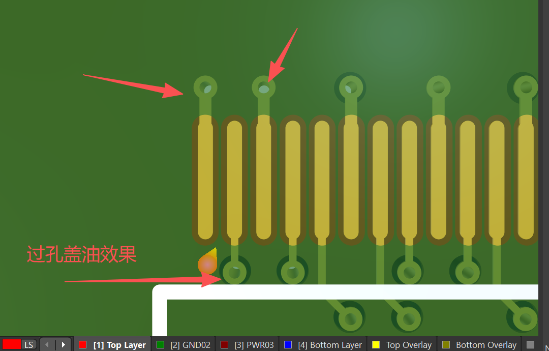 而对过孔单独进行盖油处理,避免刷锡膏的时候,刷到过孔时造成的短路,在绿油保护下,也能防止过孔在空气中暴露氧化,影响PCB板性能。