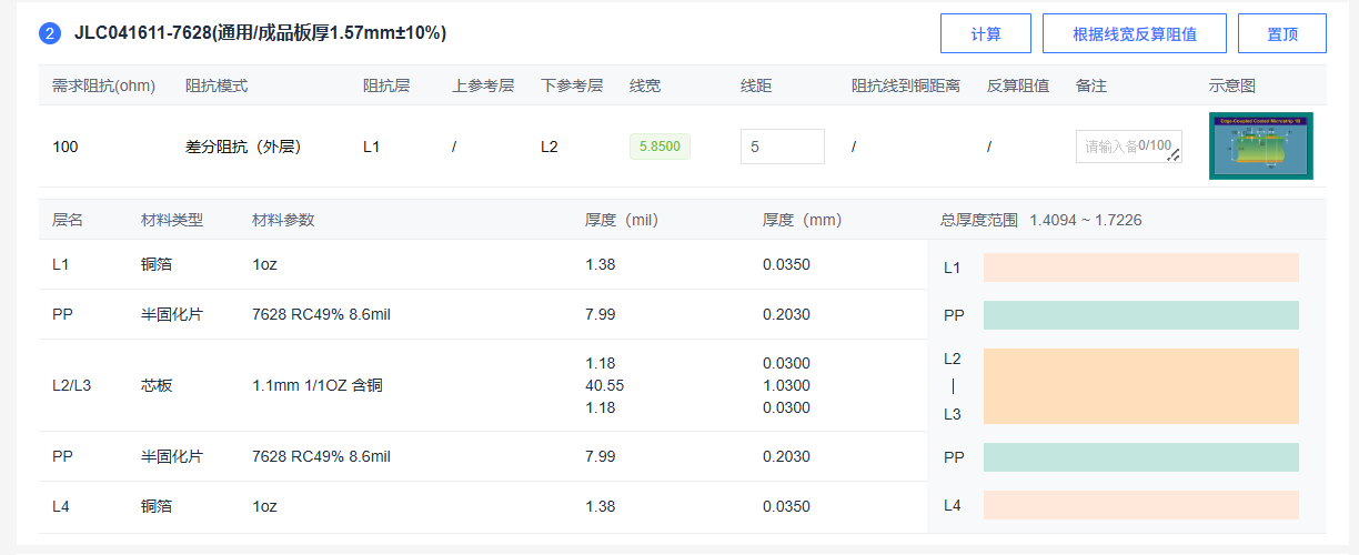 通过计算,上面的间距线宽只有3.58mil,不满足PCB的制程能力,我们往下看下面的线宽5.8mil、线距5mil,满足制程要求,我们可以选择这个叠层。