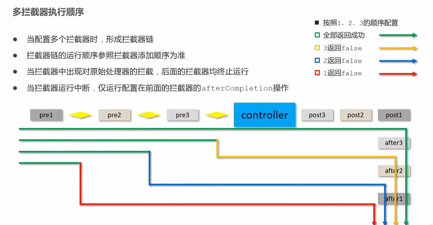 preHandler()方法返回了true,则后面 拦截器均被终止运行,仅运行前面 拦截器(不包括当前拦截器)的afterCompletion()方法。