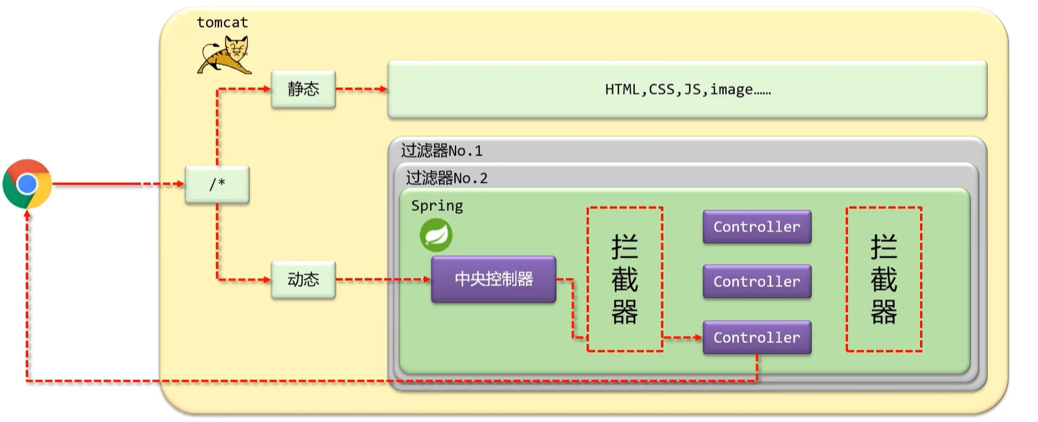 - 拦截内容不同:过滤器对所有访问进行增强,拦截器只针对SpringMVC的访问进行增强。