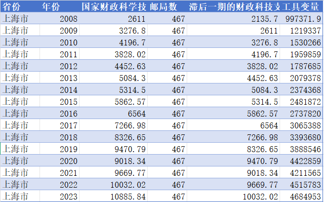 具体数据参考陶锋 等(2025)的做法,首先,基于份额转移法的基本原理构建工具变量,以全国科技支出体现工具变量的时变性,使用1984年各省份的邮局总数与滞后一期全国科技支出的乘积作为第一个工具变量。