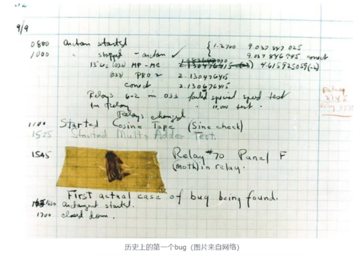 "Bug"的创始人格蕾丝·赫柏(GraceMurrayHopper),她是一位为美国海军工作的电脑专家,1947年9月9日,格 蕾丝·赫柏对HarvardMarkII设置好17000个继电器进行编程后,技术人员正在进行整机运行时,它突然停止了工 作。于是他们爬上去找原因,发现这台巨大的计算机内部一组继电器的触点之间有一只飞蛾,这显然是由于飞蛾受 光和热的吸引,飞到了触点上,然后被高电压击死。所以在报告中,赫柏用胶条贴上飞蛾,并把"bug"来表示"一个 在电脑程序里的错误","Bug"这个说法一直沿用到今天。