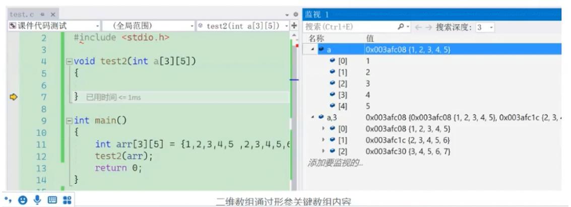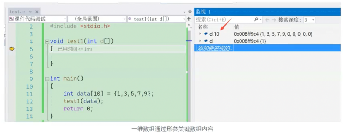 ·在数组传参,调试进入函数,如何在监视窗口观察数组的内容:数组名,n的形式