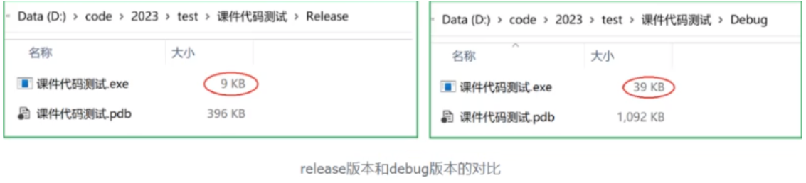 对比可以看到从同一段代码,编译生成的可执行文件的大小,release版本明显要小,而debug版本明显大。