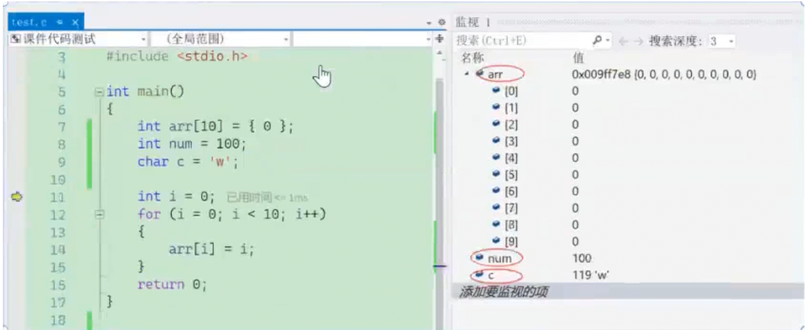 如果监视窗口看的不够仔细,也是可以观察变量在内存中的存储情况,还是在调试】 -> 【窗口】 -> 【监视】