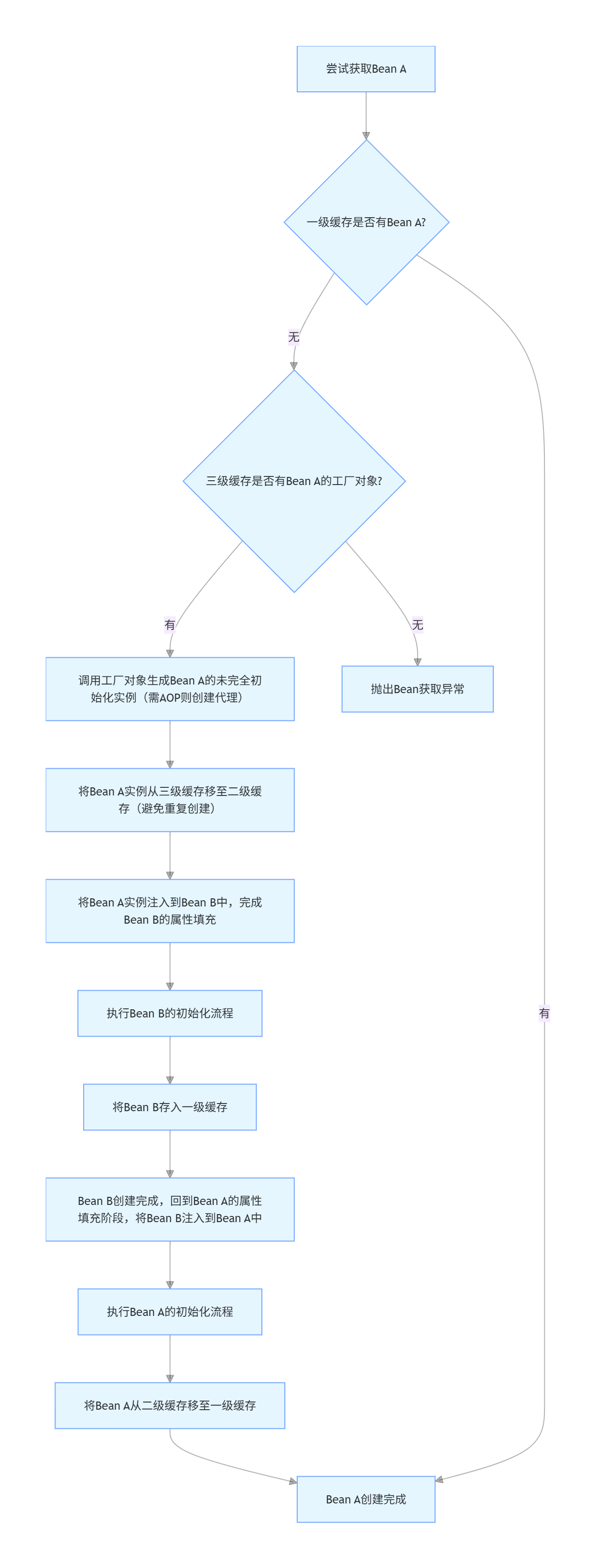ObjectFactory)存入三级缓存,此时 Bean A 处于 "未完全初始化" 状态; - 进入 Bean A 的 "属性填充" 阶段,发现需要注入 Bean B。