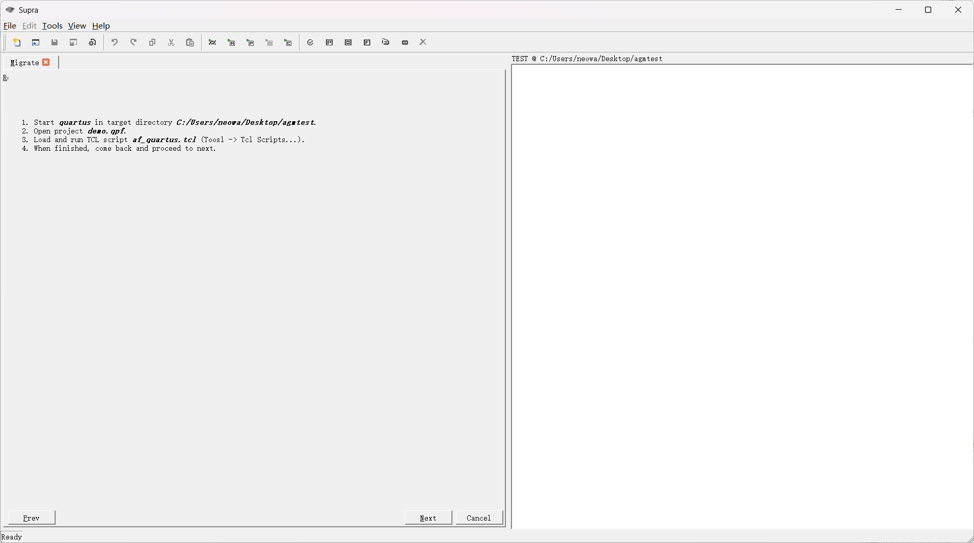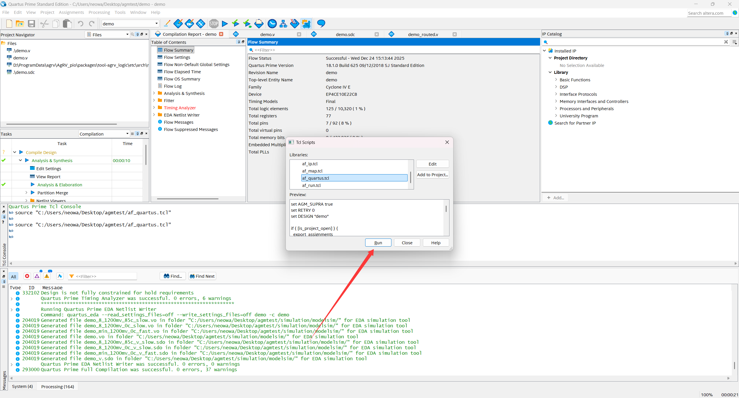然后在Quartus内找到Tools-> Tcl Script... 然后选择 af_quartus.tcl然后点击run,运行结束后,返回Supra,再一次点击Next.