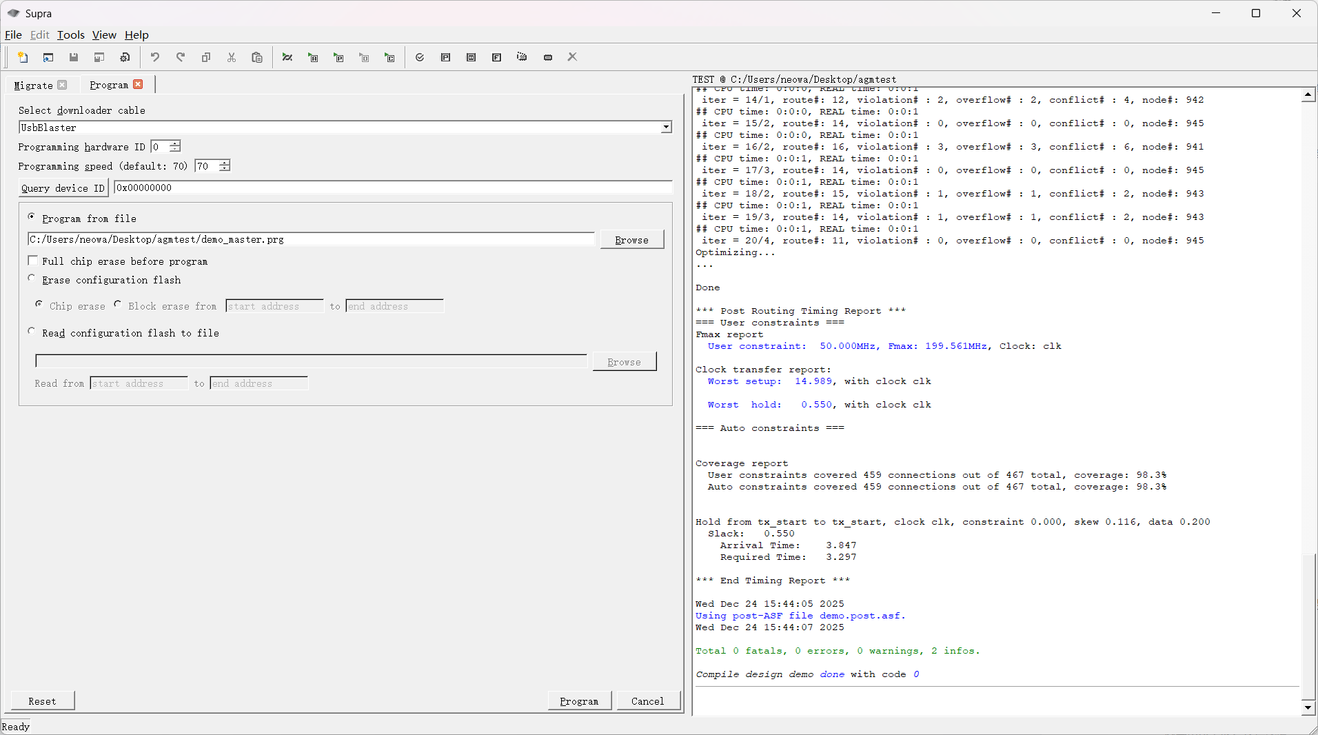 第五步:烧录。点击Supra的 Tools -> Program,链接USB Blaster,选择布线出来的prg文件,然后点击Program即可。