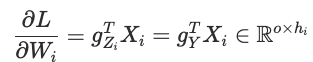 - 这里异步进行输入x的梯度的all reduce求和,从而能够与后续权重梯度计算重叠(计算权重w梯度不需要x的梯度)。如果使用了SP,则使用reduce scatter聚合后的输入梯度分片给其他参与SP的GPU。权重梯度计算公式如下。